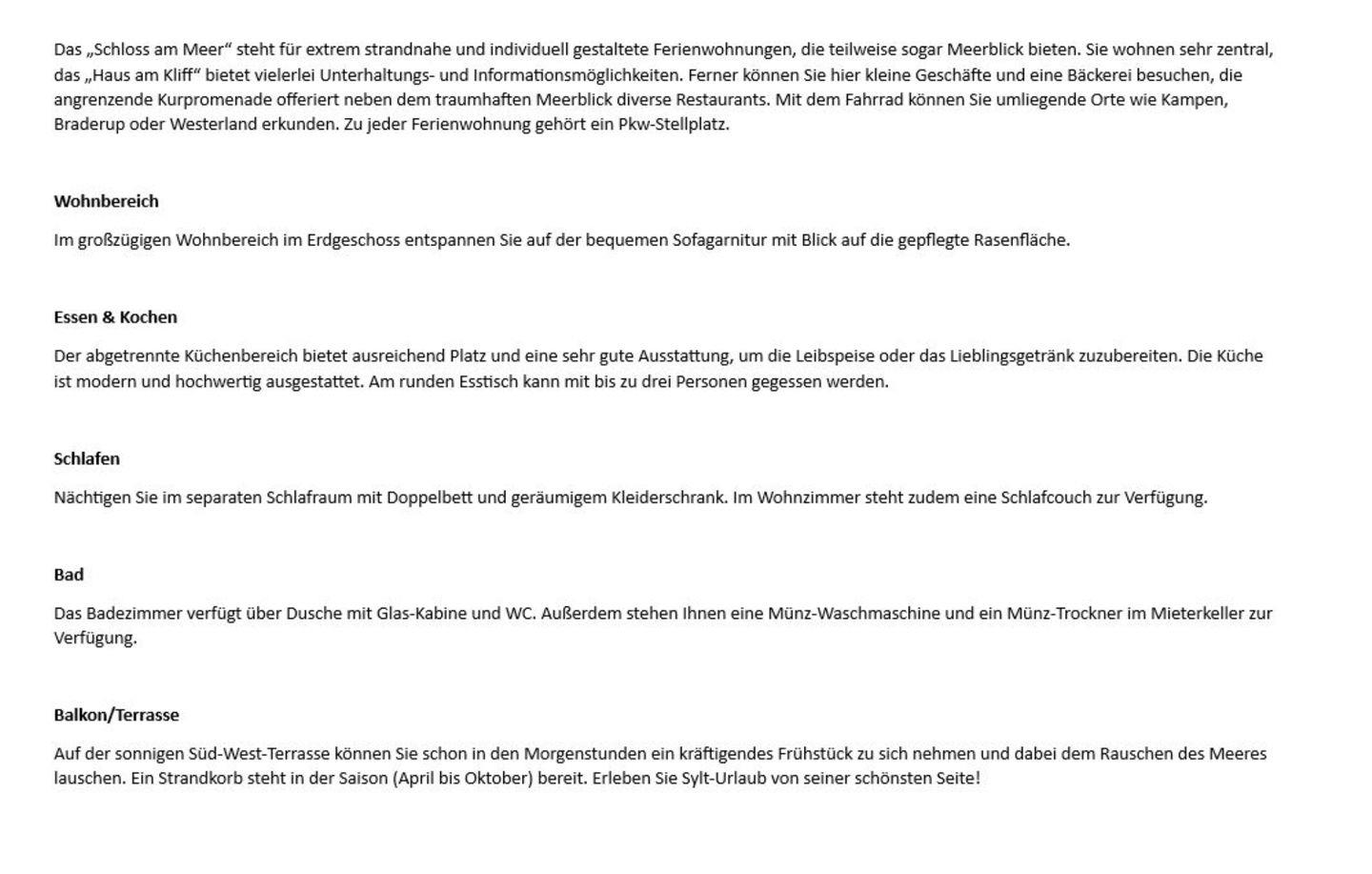 Das „Schloss am Meer“ steht für extrem strandnahe und individuell gestaltete Ferienwohnungen, die teilweise sogar Meerblick bieten. Sie wohnen sehr zentral, das „Haus am Kliff“ bietet vielerlei Unterhaltungs- und Informationsmöglichkeiten. Ferner können Sie hier kleine Geschäfte und eine Bäckerei besuchen, die angrenzende Kurpromenade offeriert neben dem traumhaften Meerblick diverse Restaurants. Mit dem Fahrrad können Sie umliegende Orte wie Kampen, Braderup oder Westerland erkunden. Zu jeder Ferienwohnung gehört ein Pkw-Stellplatz.