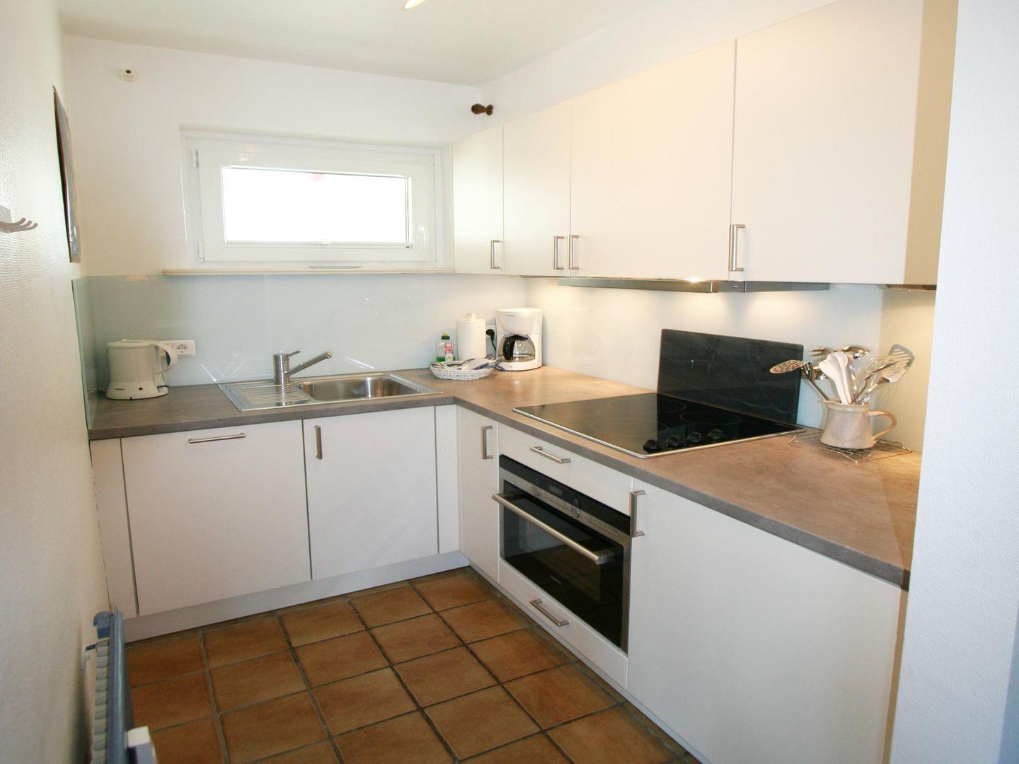 Der abgetrennte Küchenbereich bietet ausreichend Platz und eine sehr gute Ausstattung, um die Leibspeise oder das Lieblingsgetränk zuzubereiten. Die Küche ist modern und hochwertig ausgestattet. Am runden Esstisch kann mit bis zu drei Personen gegessen werden.