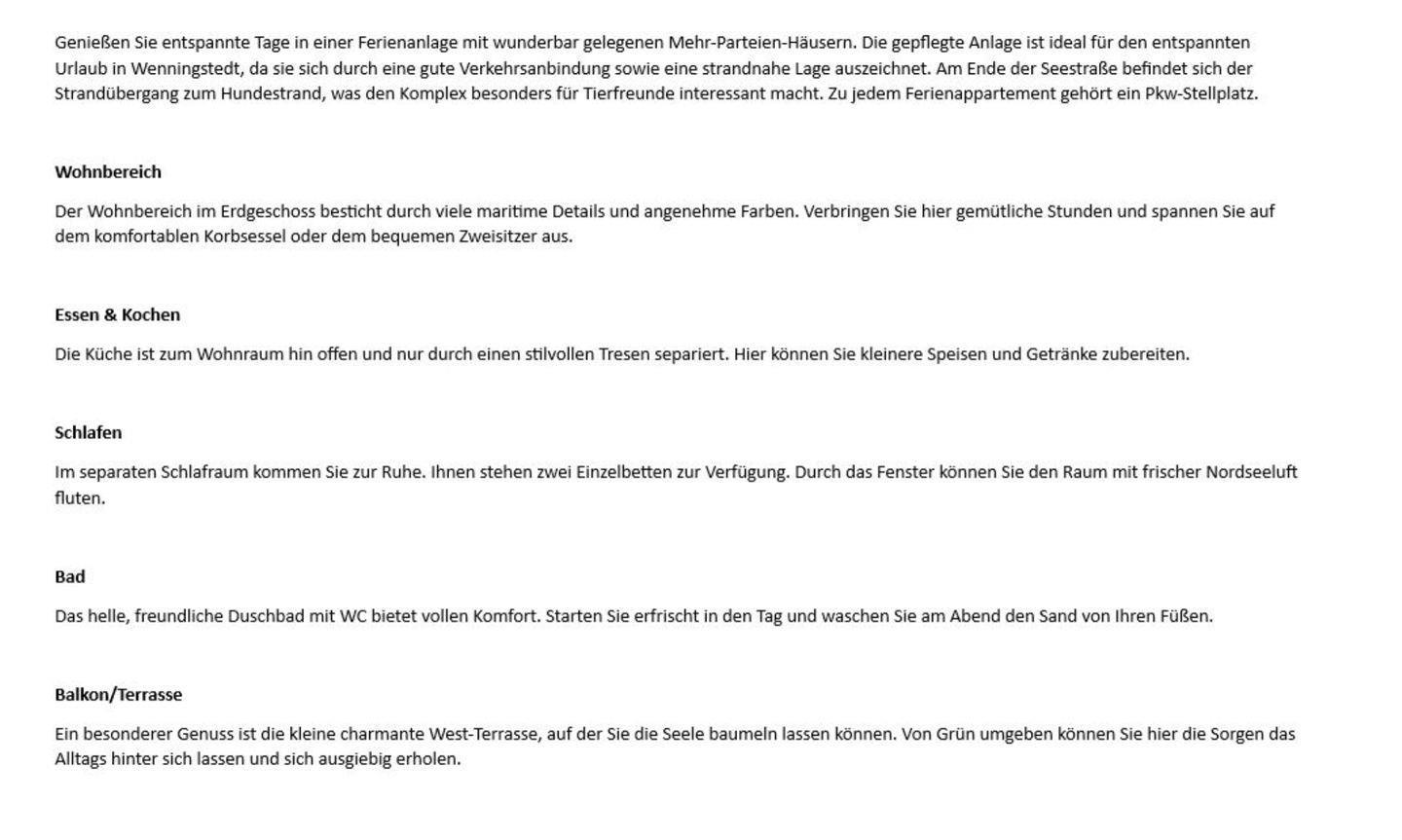 Gemütliches Erdgeschoss-Appartement in strandnaher Lage im schönen Wenningstedt. Die tolle Strand-Optik des Wohnbereichs trägt ebenso zur Entspannung bei wie die nach Westen gerichtete Terrasse. Urlauben Sie hier und erholen Sie sich ausgiebig – ob allein oder zu zweit! Gern dürfen Sie auch Ihren Vierbeiner mitbringen.
