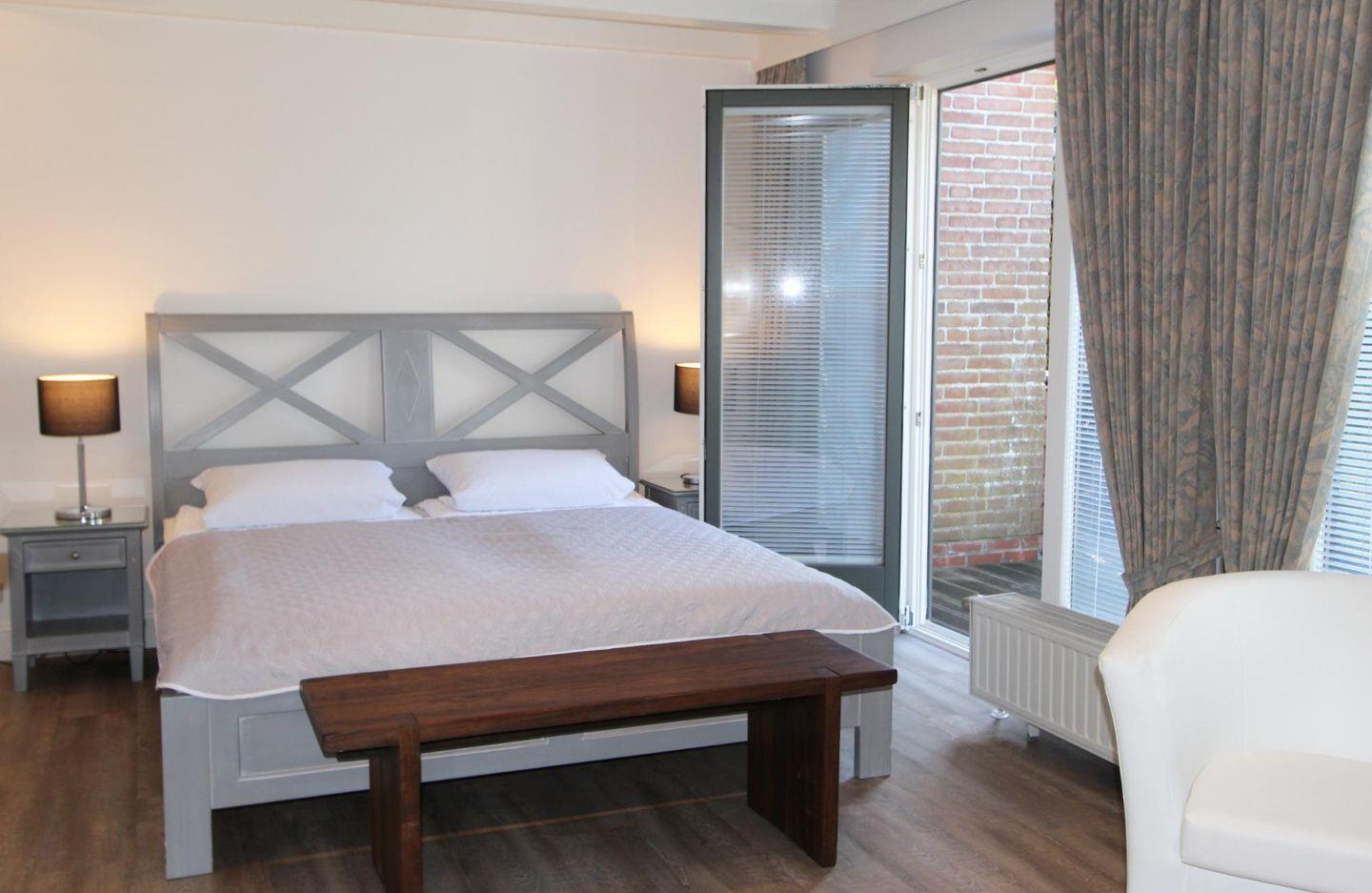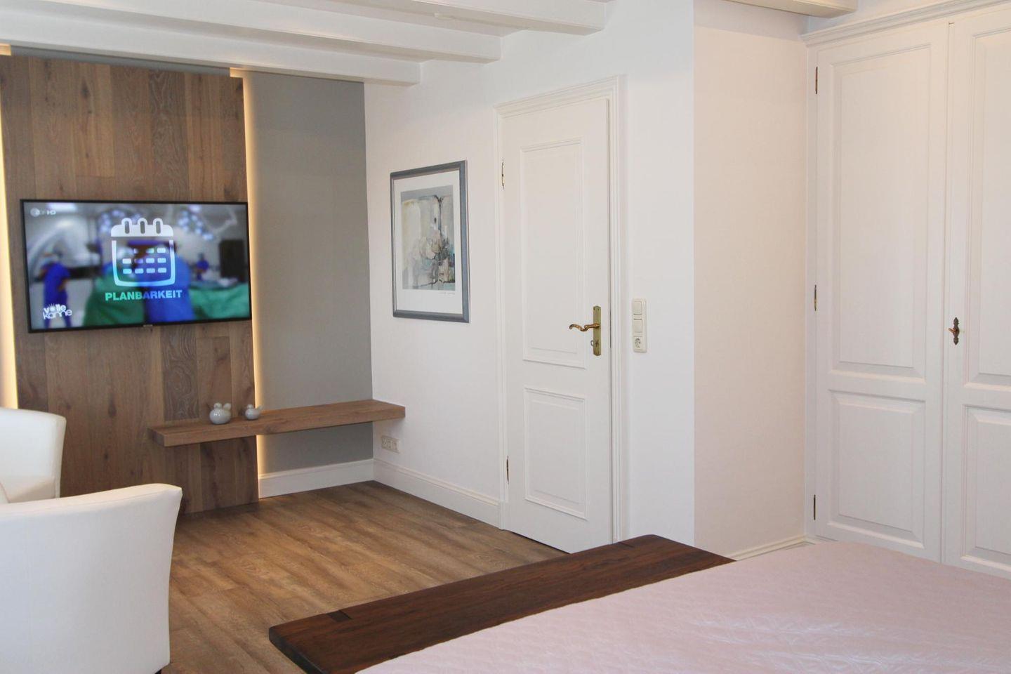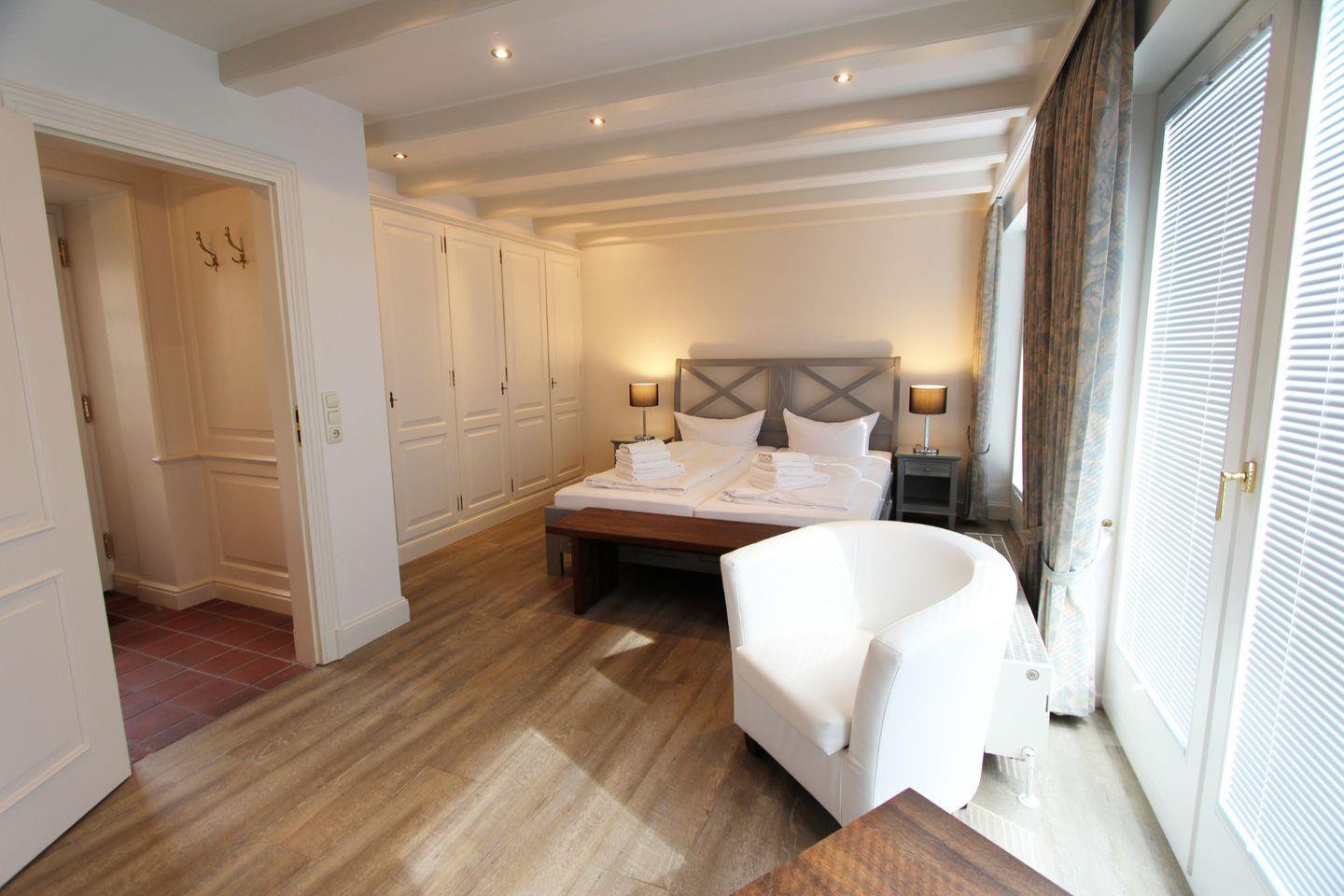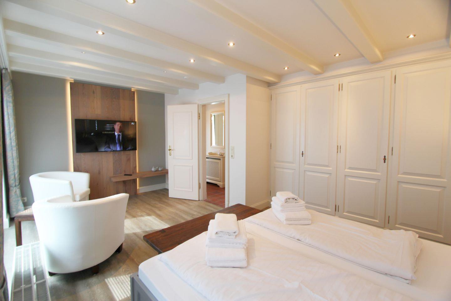Der große Schlafraum bietet neben einem bequemen Doppelbett und einer kleinen Sitzecke ein zweites TV-Gerät und direkten Zugang zur Terrasse. Der Blick auf ein gepflegtes Gartenstück setzt diesem Raum die Krone auf.