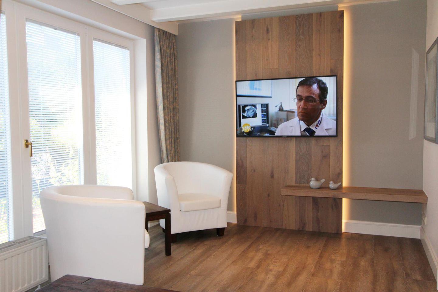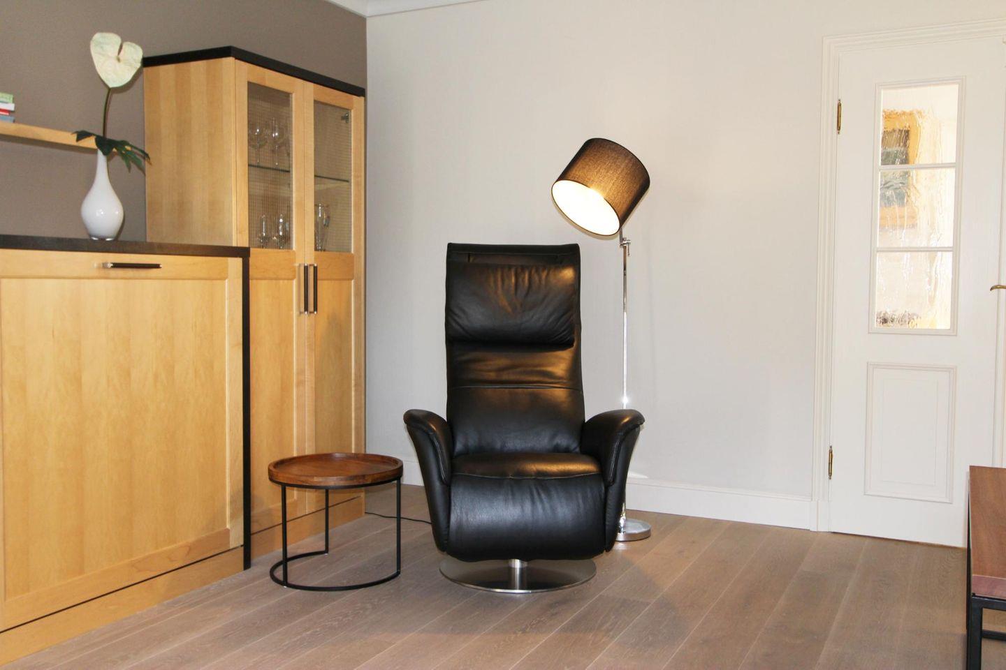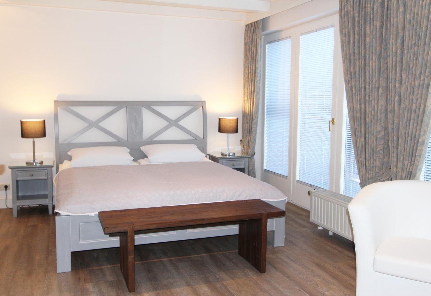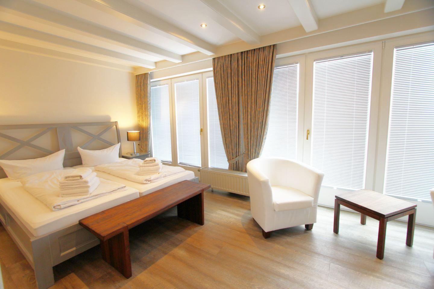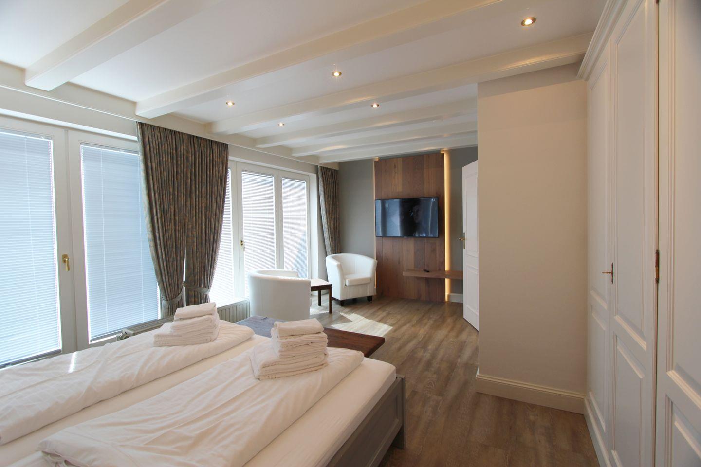 Der große Schlafraum bietet neben einem bequemen Doppelbett und einer kleinen Sitzecke ein zweites TV-Gerät und direkten Zugang zur Terrasse. Der Blick auf ein gepflegtes Gartenstück setzt diesem Raum die Krone auf.