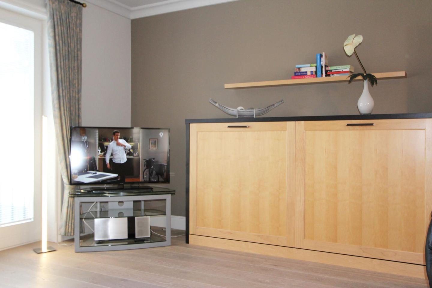 Im offen geschnittenen Wohnbereich im Erdgeschoss entspannen Sie auf dem bequemen Sofa und dem komfortablen Sessel. Ein integriertes Schrankbett bietet die Möglichkeit, getrennt zu schlafen.
