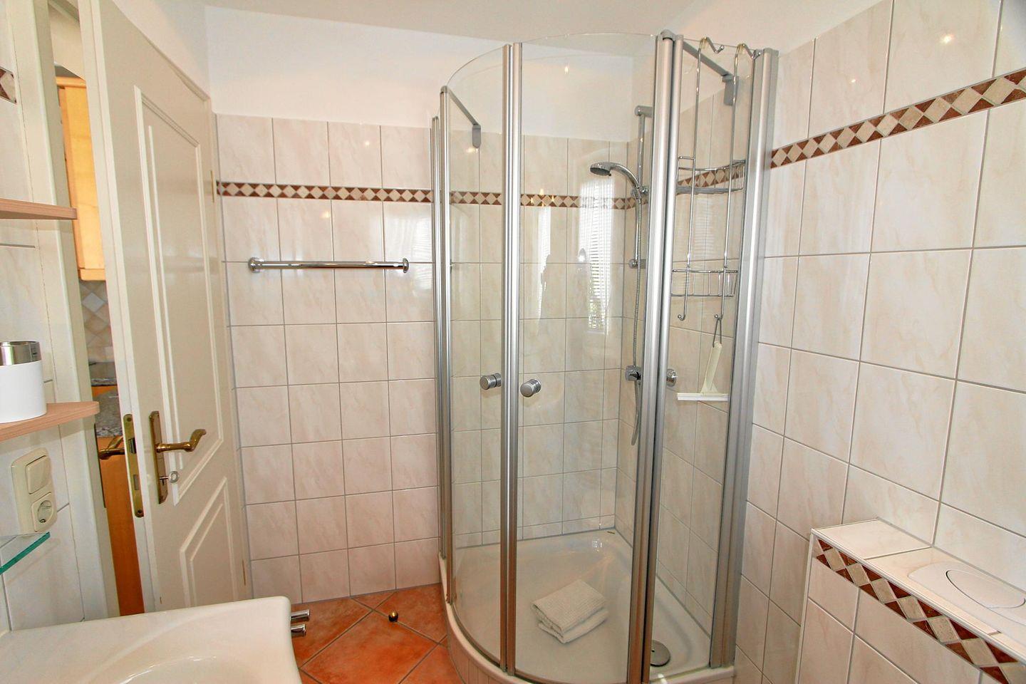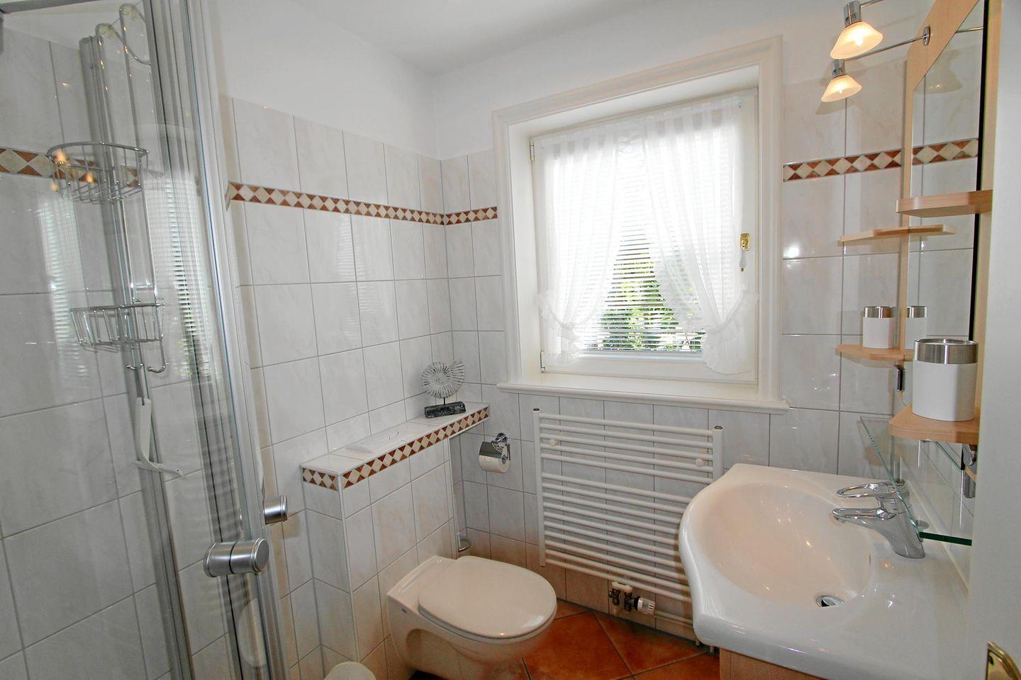 Das separate Badezimmer mit Dusche und WC verfügt über ein Fenster, durch das der Raum vom Tageslicht geflutet wird.