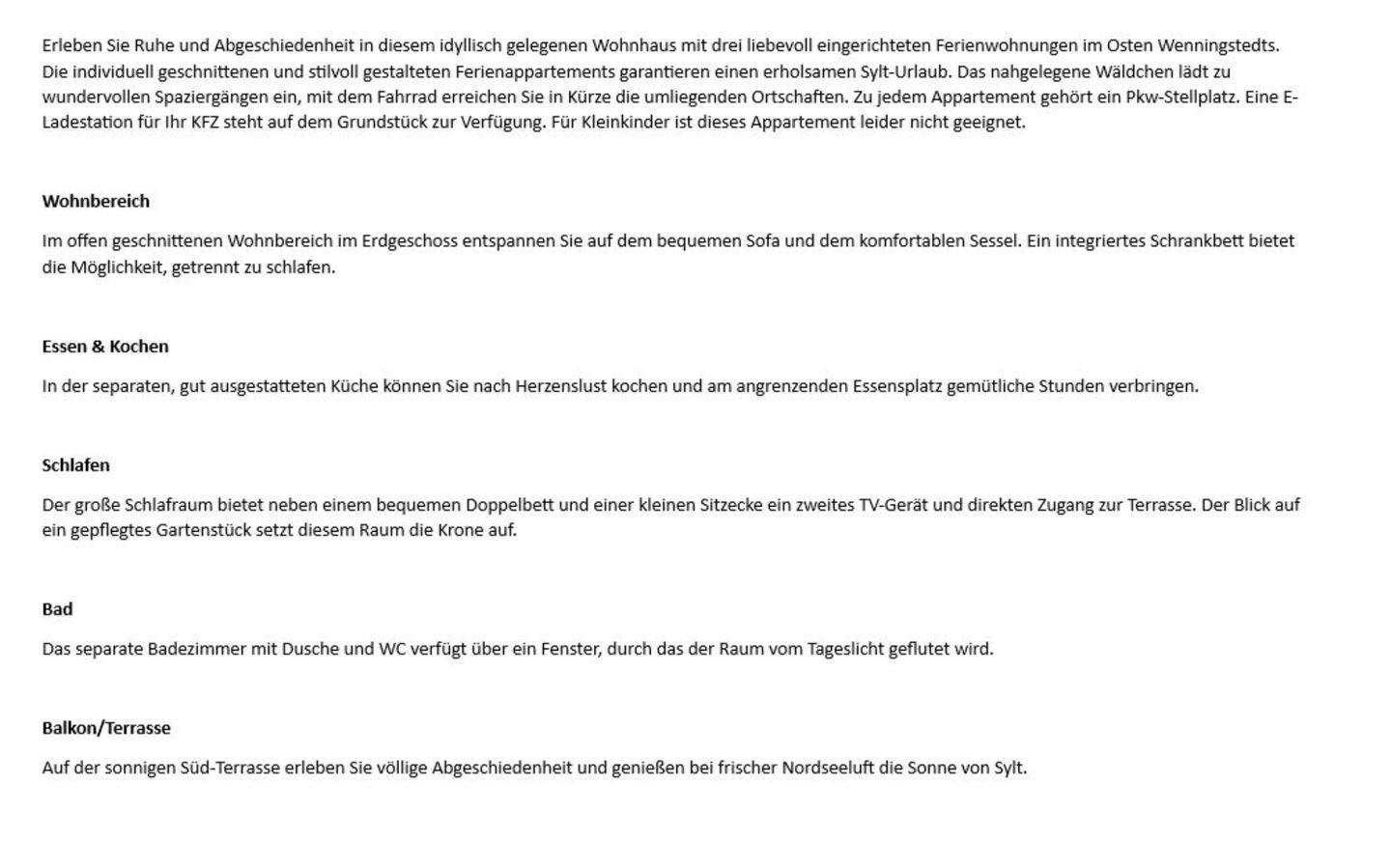 Erleben Sie Ruhe und Abgeschiedenheit in diesem idyllisch gelegenen Wohnhaus mit drei liebevoll eingerichteten Ferienwohnungen im Osten Wenningstedts. Die individuell geschnittenen und stilvoll gestalteten Ferienappartements garantieren einen erholsamen Sylt-Urlaub. Das nahgelegene Wäldchen lädt zu wundervollen Spaziergängen ein, mit dem Fahrrad erreichen Sie in Kürze die umliegenden Ortschaften. Zu jedem Appartement gehört ein Pkw-Stellplatz. Eine E-Ladestation für Ihr KFZ steht auf dem Grundstück zur Verfügung. Für Kleinkinder ist dieses Appartement leider nicht geeignet.