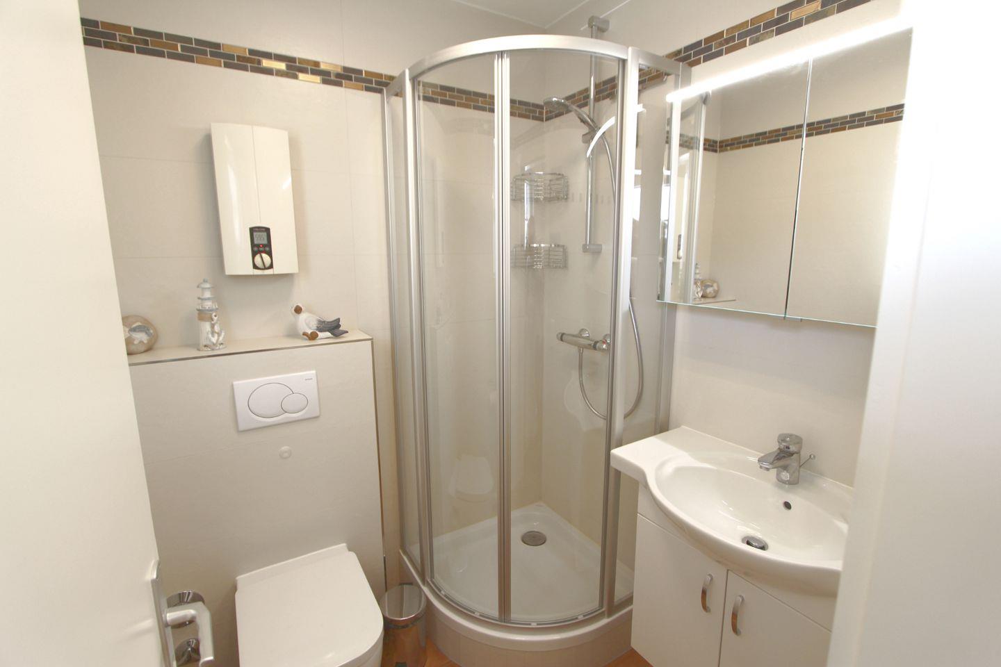 Das separate Badezimmer verfügt über eine schöne Eck-Dusche und WC. Durch ein Fenster können Sie frische Nordseeluft einströmen lassen.