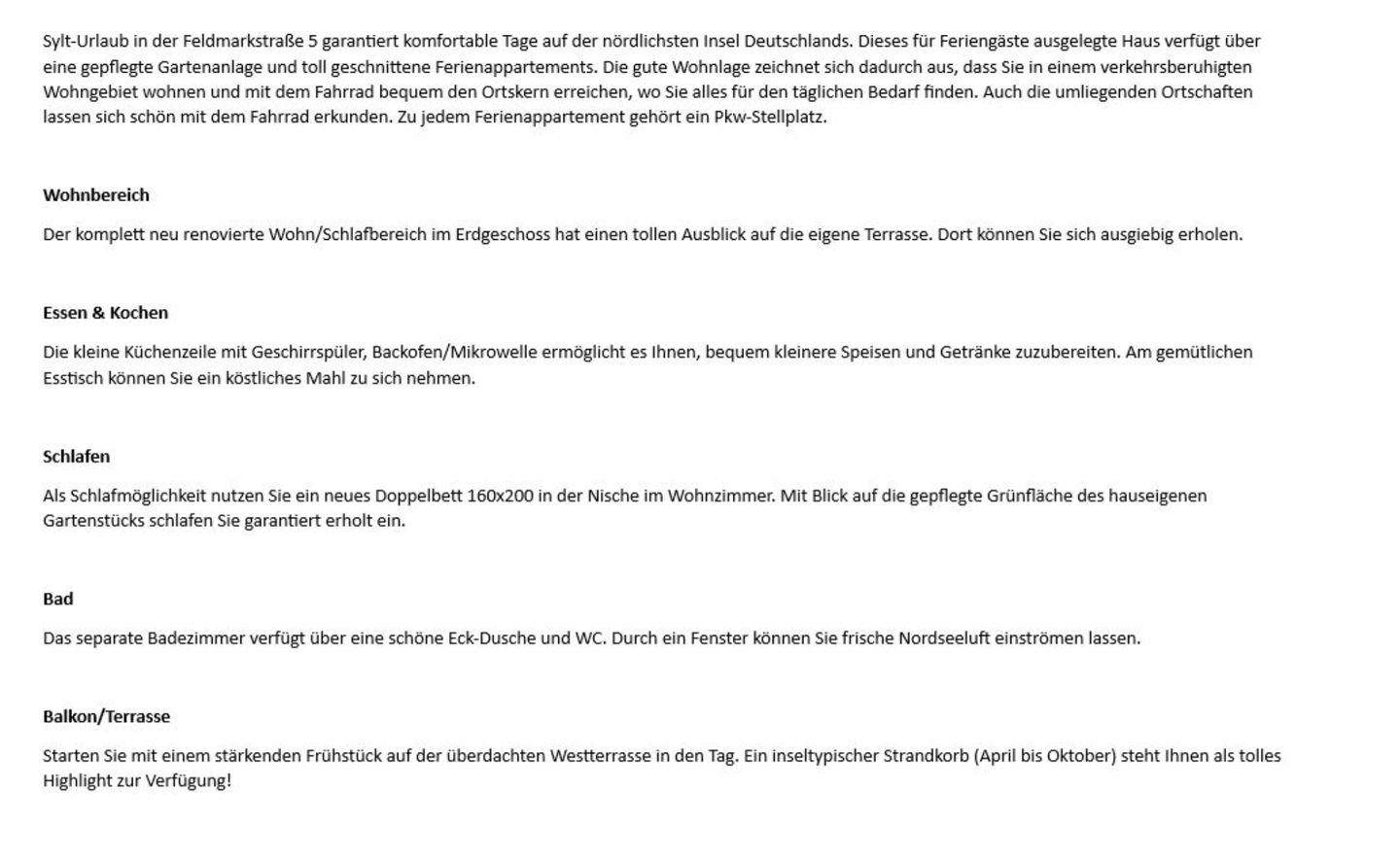 Sylt-Urlaub in der Feldmarkstraße 5 garantiert komfortable Tage auf der nördlichsten Insel Deutschlands. Dieses für Feriengäste ausgelegte Haus verfügt über eine gepflegte Gartenanlage und toll geschnittene Ferienappartements. Die gute Wohnlage zeichnet sich dadurch aus, dass Sie in einem verkehrsberuhigten Wohngebiet wohnen und mit dem Fahrrad bequem den Ortskern erreichen, wo Sie alles für den täglichen Bedarf finden. Auch die umliegenden Ortschaften lassen sich schön mit dem Fahrrad erkunden. Zu jedem Ferienappartement gehört ein Pkw-Stellplatz.