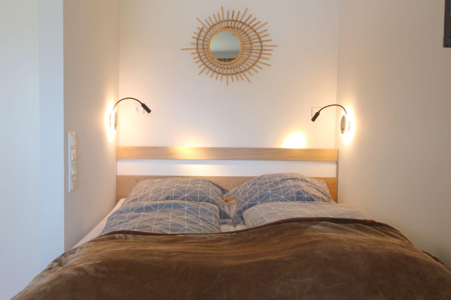 Als Schlafmöglichkeit nutzen Sie ein neues Doppelbett 160x200 in der Nische im Wohnzimmer. Mit Blick auf die gepflegte Grünfläche des hauseigenen Gartenstücks schlafen Sie garantiert erholt ein.