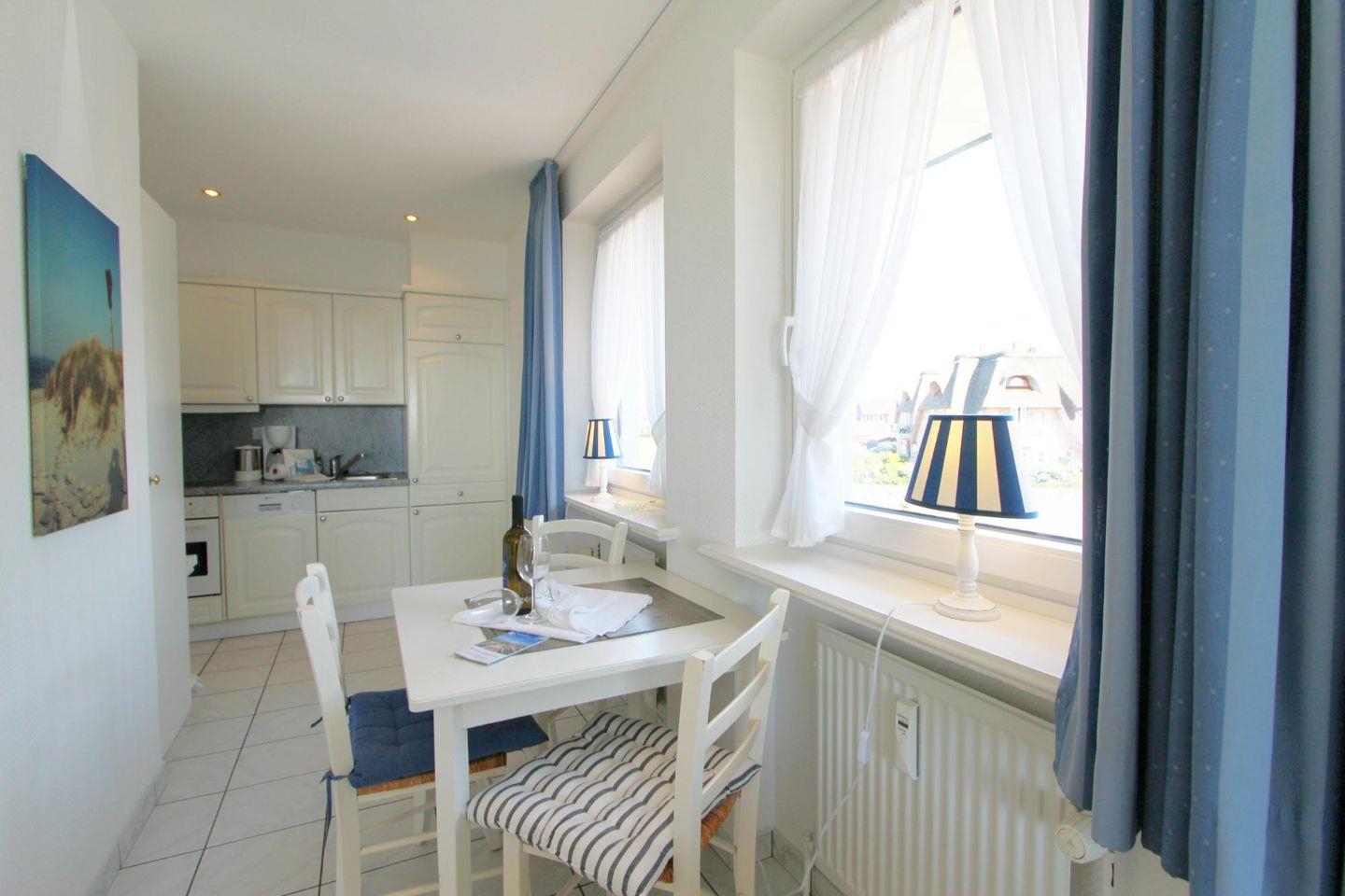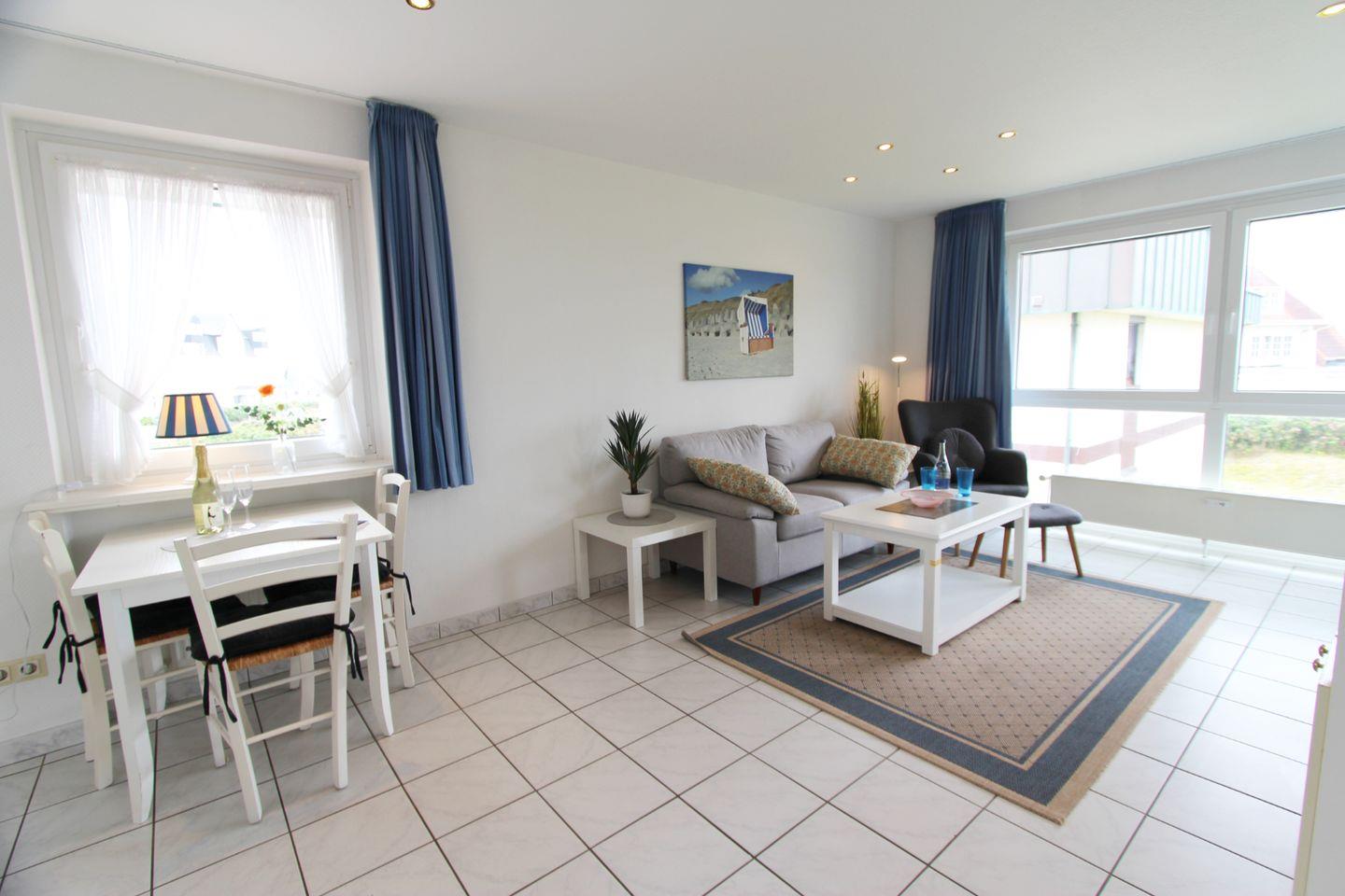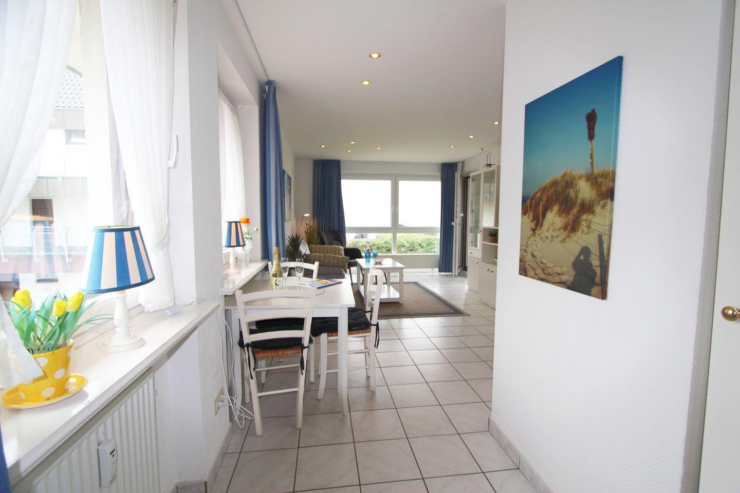 Individuell geschnittene Ferienwohnung mit zwei Zimmern auf einer Ebene im ersten Obergeschoss. Die Lage in direkter Nähe zur neu gestalteten Kurpromenade und der Blick aufs Blau des Meeres machen diese Wohnung besonders!