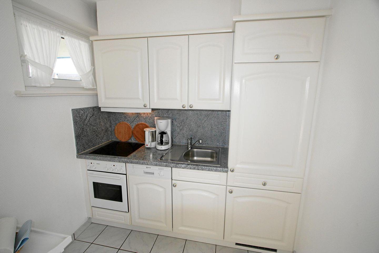 Das Badezimmer ist hell gefliest und verfügt über eine Eck-Dusche und WC. Ferner fällt durch das Fenster Tageslicht herein und man kann die frische Nordseeluft einströmen lassen. Außerdem stehen Ihnen eine Münz-Waschmaschine und ein Münz-Trockner im Mieterkeller zur Verfügung.