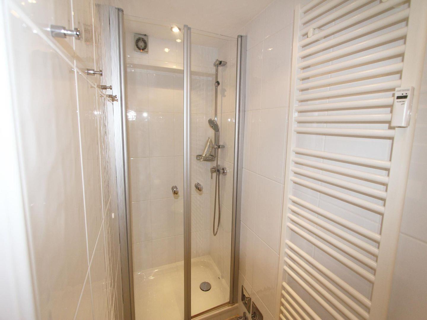 Direkt an das Schlafzimmer angrenzend befindet sich das hell geflieste Duschbad mit WC. Waschmaschine und Trockner stehen als Münzgeräte im Keller des Hauses zur Verfügung.