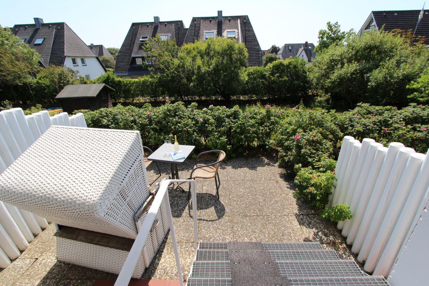 Genießen Sie auf der Süd-Terrasse die Sonne. Hier können Sie mit einem ausgiebigen Frühstück unter freiem Himmel optimal in einen neuen Urlaubstag auf Sylt starten. Ein eigener Strandkorb steht in der Saison zur freien Nutzung bereit.