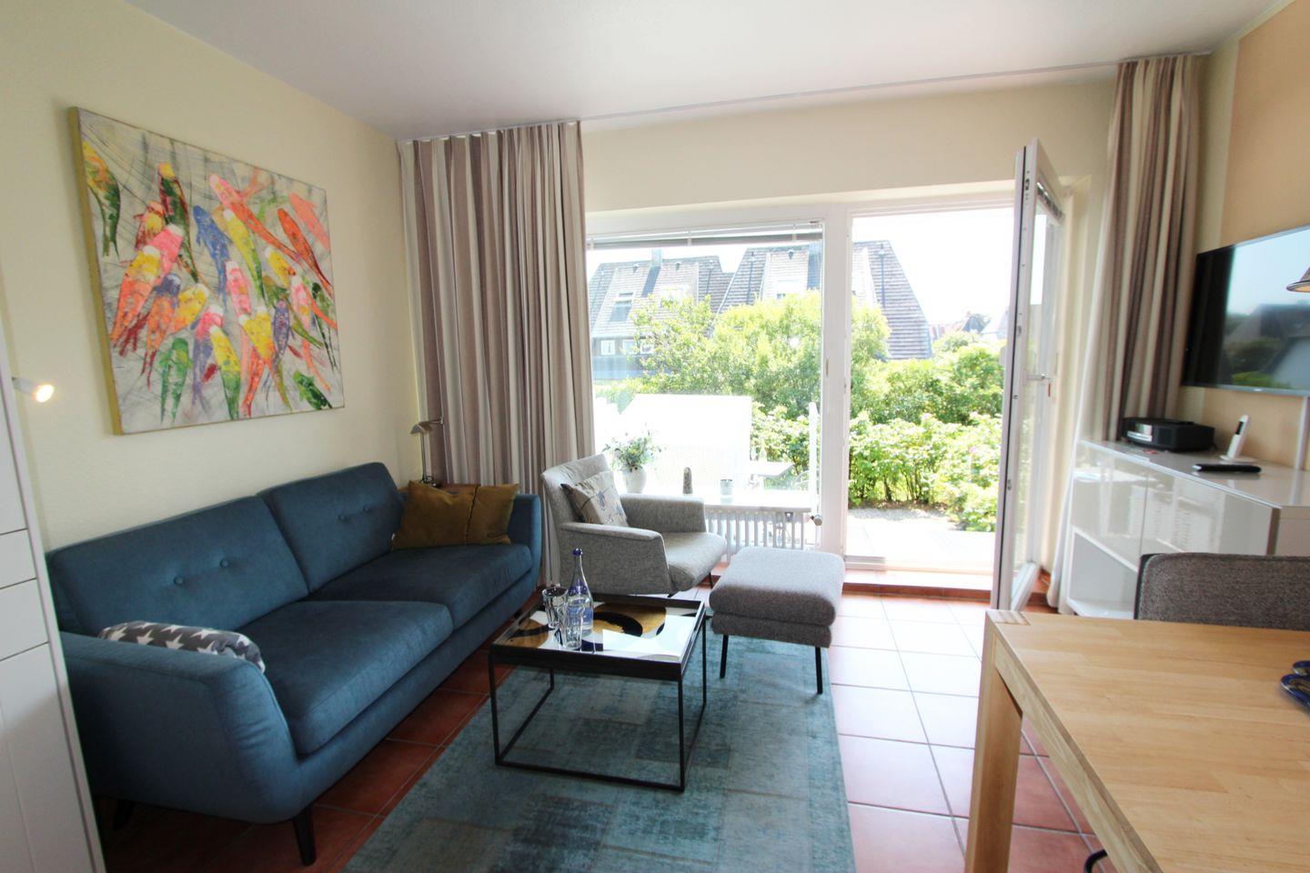 Der Wohnbereich im Erdgeschoss mit bequemer Sitzecke und Zugang zur wohnungseigenen Süd-Terrasse mit Strandkorb. Der ideale Ort, um ausgiebig zu entspannen!