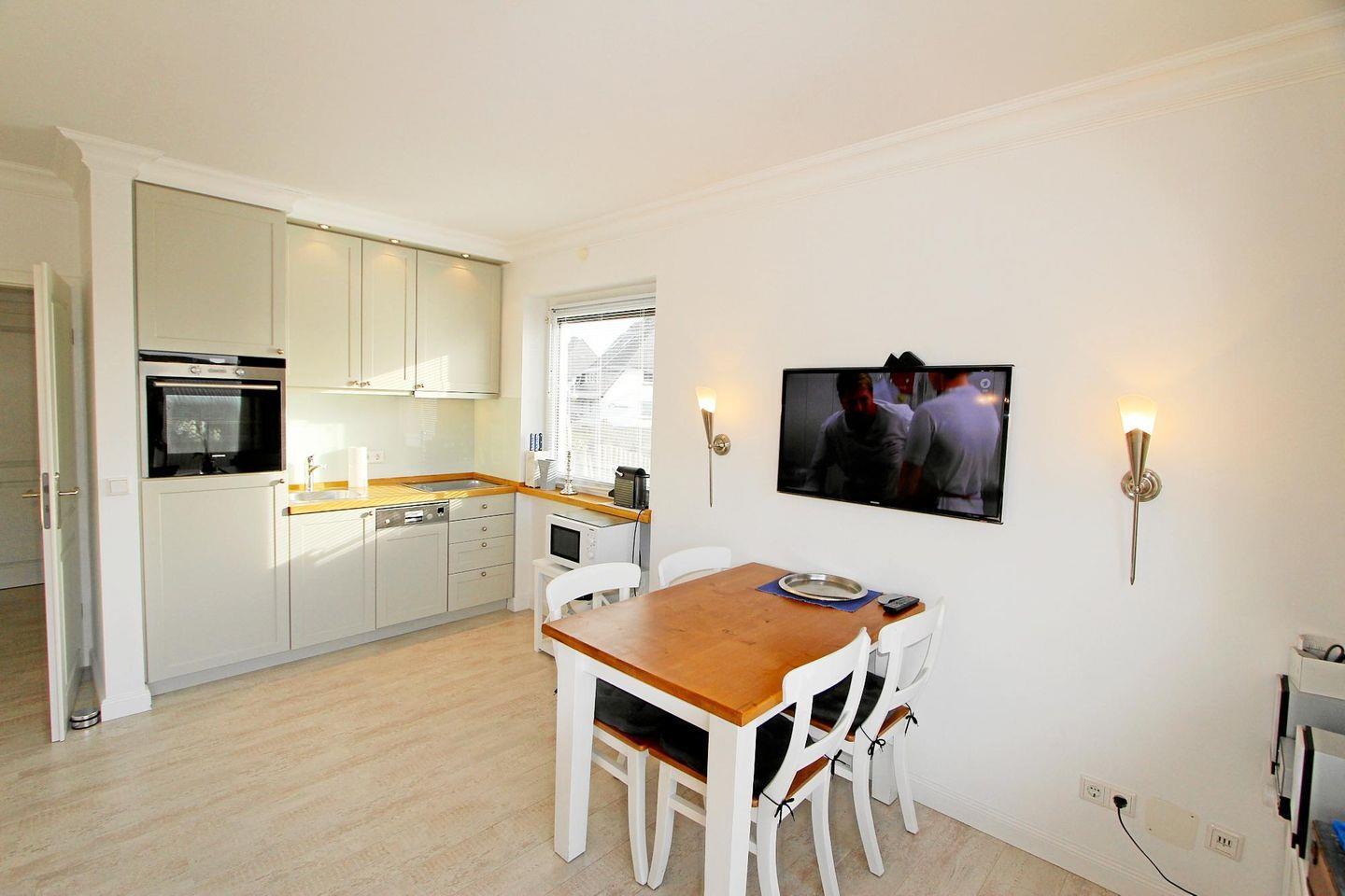Im offen gehaltenen Wohn- und Essbereich können Sie nach Herzenslust schlemmen. Die kleine Küchenzeile ist gut ausgestattet, um kleinere Speisen und Getränke zuzubereiten.