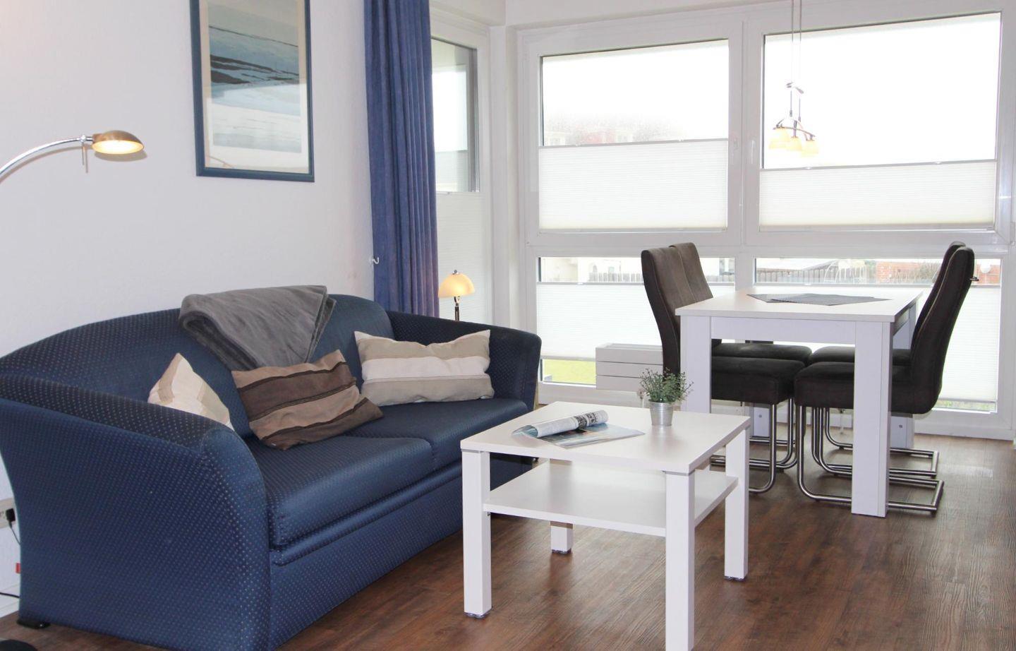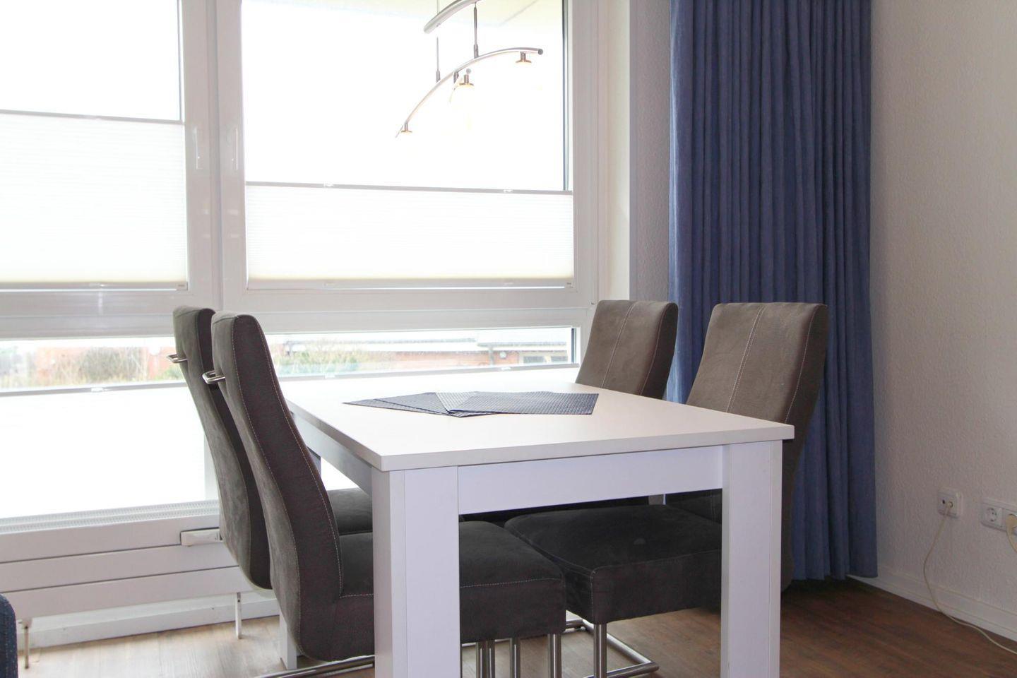 Der separate Küchenbereich bietet ausreichend Platz für das Zubereiten von Speisen und Getränken. Direkt an der großen Fensterfront gelegen liegt der helle Essensplatz mit Blick auf die Nordsee.