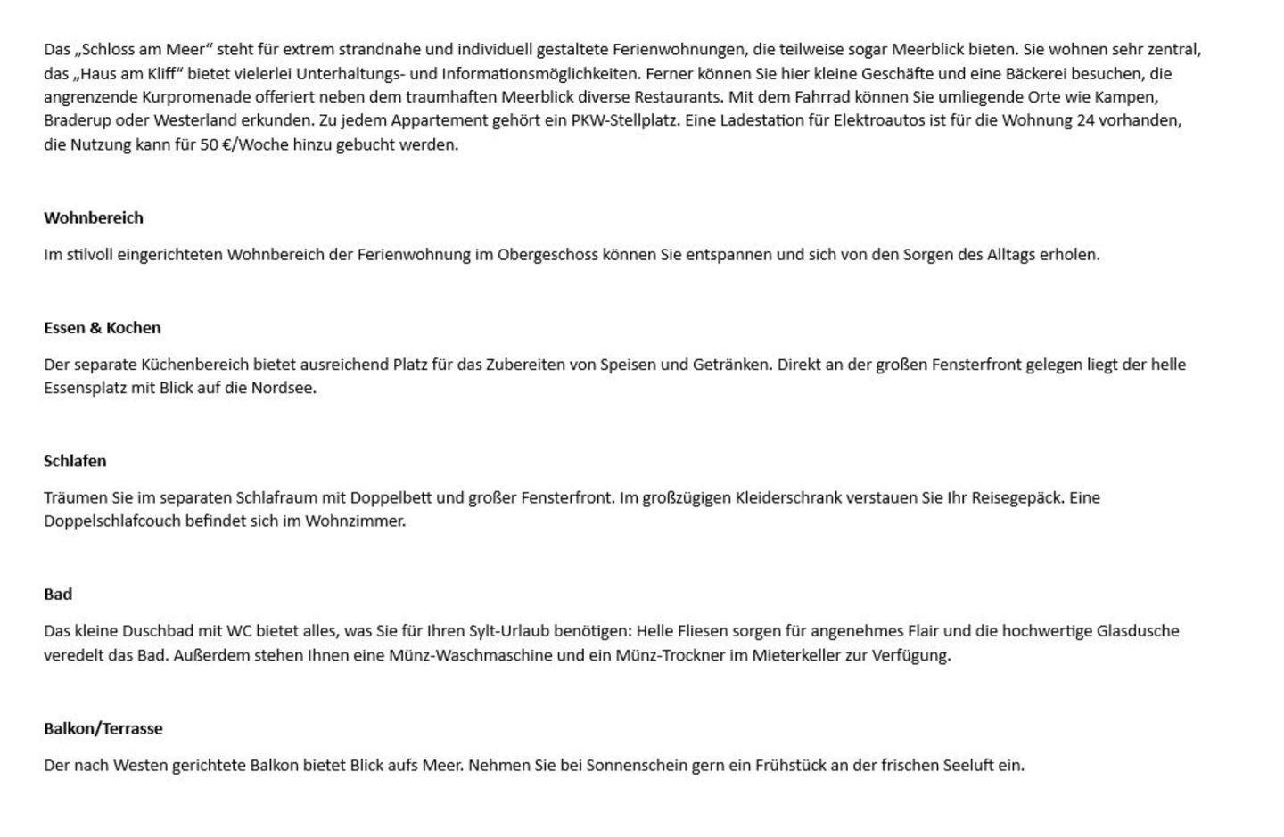Das „Schloss am Meer“ steht für extrem strandnahe und individuell gestaltete Ferienwohnungen, die teilweise sogar Meerblick bieten. Sie wohnen sehr zentral, das „Haus am Kliff“ bietet vielerlei Unterhaltungs- und Informationsmöglichkeiten. Ferner können Sie hier kleine Geschäfte und eine Bäckerei besuchen, die angrenzende Kurpromenade offeriert neben dem traumhaften Meerblick diverse Restaurants. Mit dem Fahrrad können Sie umliegende Orte wie Kampen, Braderup oder Westerland erkunden. Zu jedem Appartement gehört ein PKW-Stellplatz. Eine Ladestation für Elektroautos ist für die Wohnung 24 vorhanden, die Nutzung kann für 50 €/Woche hinzu gebucht werden.