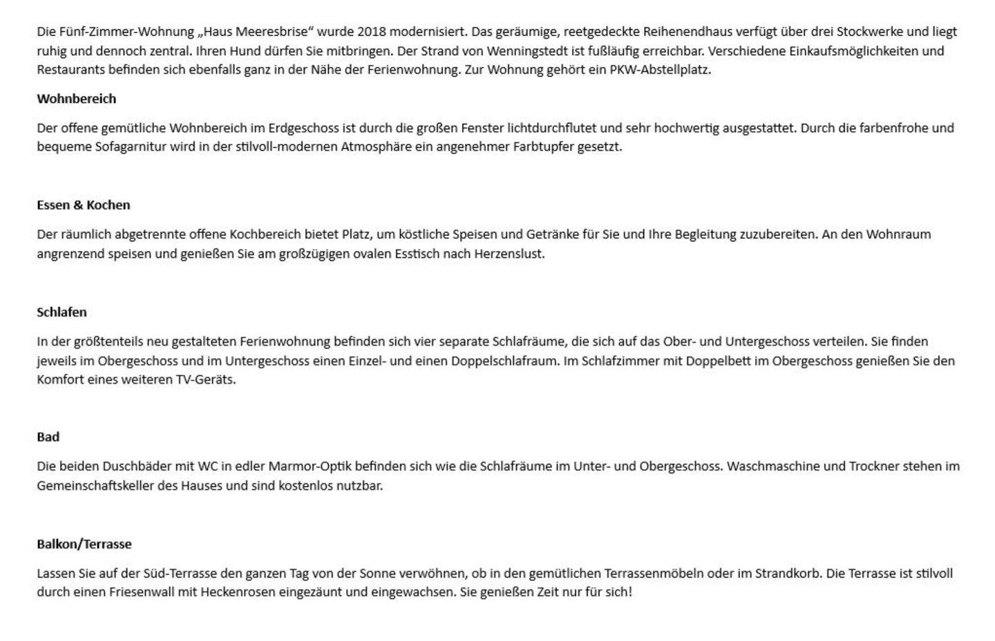 Die Fünf-Zimmer-Wohnung „Haus Meeresbrise“ wurde 2018 modernisiert. Das geräumige, reetgedeckte Reihenendhaus verfügt über drei Stockwerke und liegt ruhig und dennoch zentral. Ihren Hund dürfen Sie mitbringen. Der Strand von Wenningstedt ist fußläufig erreichbar. Verschiedene Einkaufsmöglichkeiten und Restaurants befinden sich ebenfalls ganz in der Nähe der Ferienwohnung. Zur Wohnung gehört ein PKW-Abstellplatz.