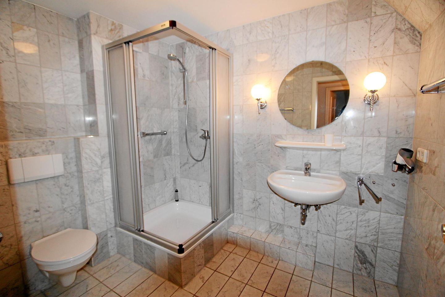 Die beiden Duschbäder mit WC in edler Marmor-Optik befinden sich wie die Schlafräume im Unter- und Obergeschoss. Waschmaschine und Trockner stehen im Gemeinschaftskeller des Hauses und sind kostenlos nutzbar.