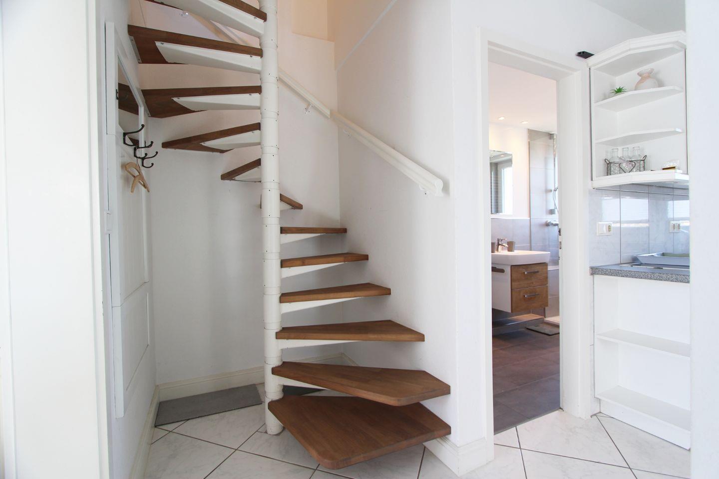 Im Obergeschoss auf einer Ebene mit Wohn- und Essbereich befindet sich ein Schlafzimmer mit zwei gemütlichen Einzelbetten. Darüber hinaus schlafen Sie im Dachgeschoss, das über eine Wendeltreppe zu erreichen ist, in einem komfortablen Doppelbett. Der Raum im Dachgeschoss ist durch eine Giebel-Fensterfront lichtdurchflutet.