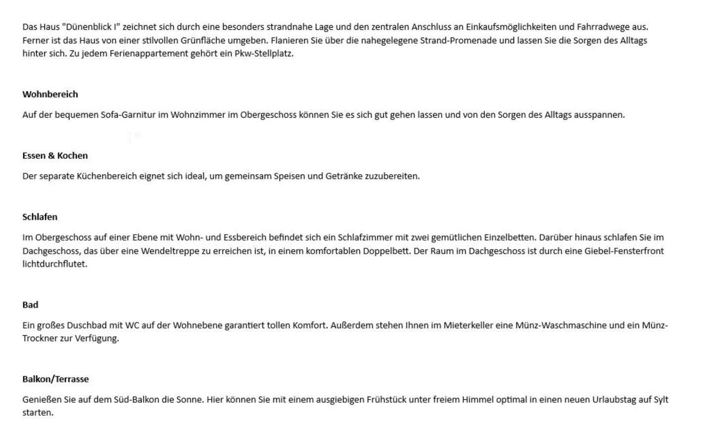 Sehr geräumige und komfortable 3-Zimmer-Wohnung nahe der modernen Wenningstedter Strandpromenade. Die Wohnung befindet sich im Ober- und Dachgeschoss des Hauses und besitzt einen sonnenverwöhnten Süd-Balkon. Genießen Sie Ihren Sylt-Urlaub mit bis zu vier Personen in vollen Zügen.