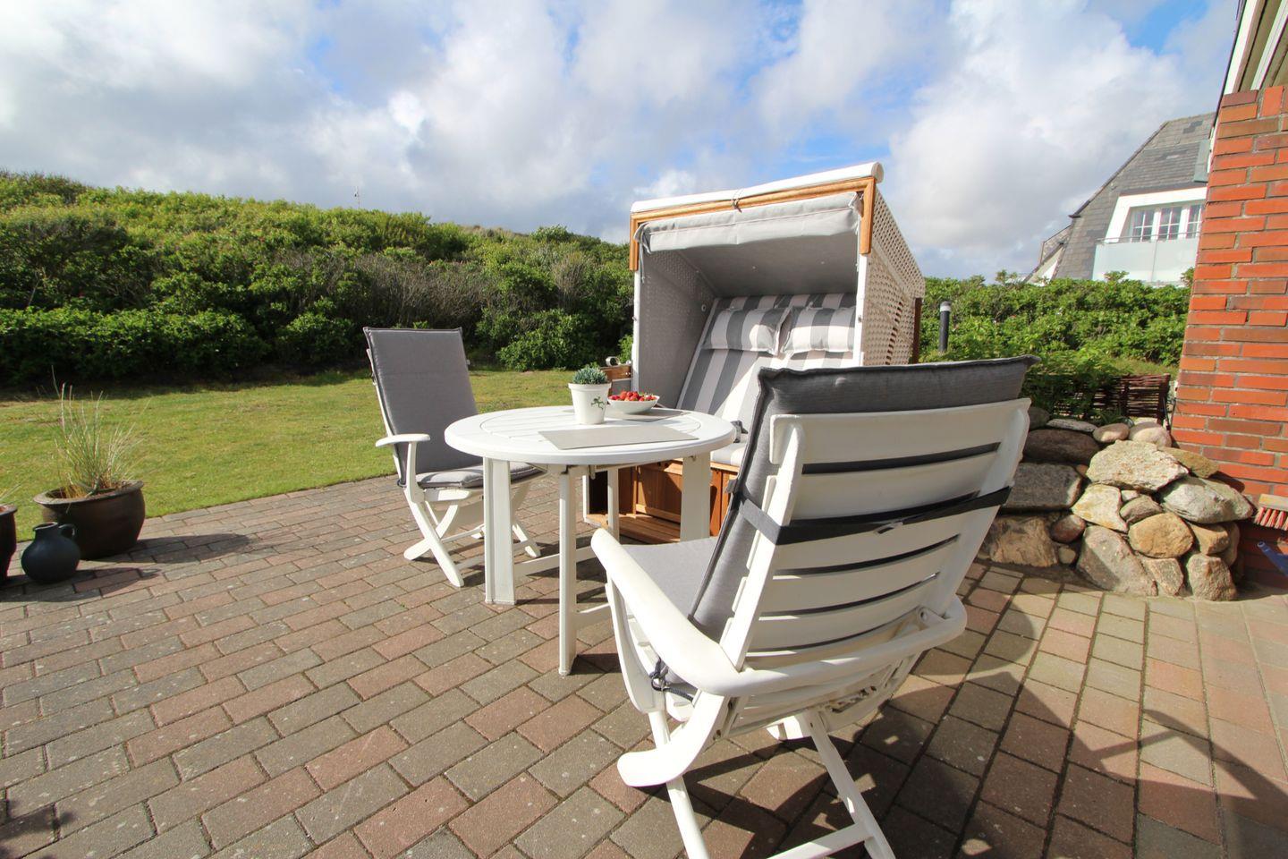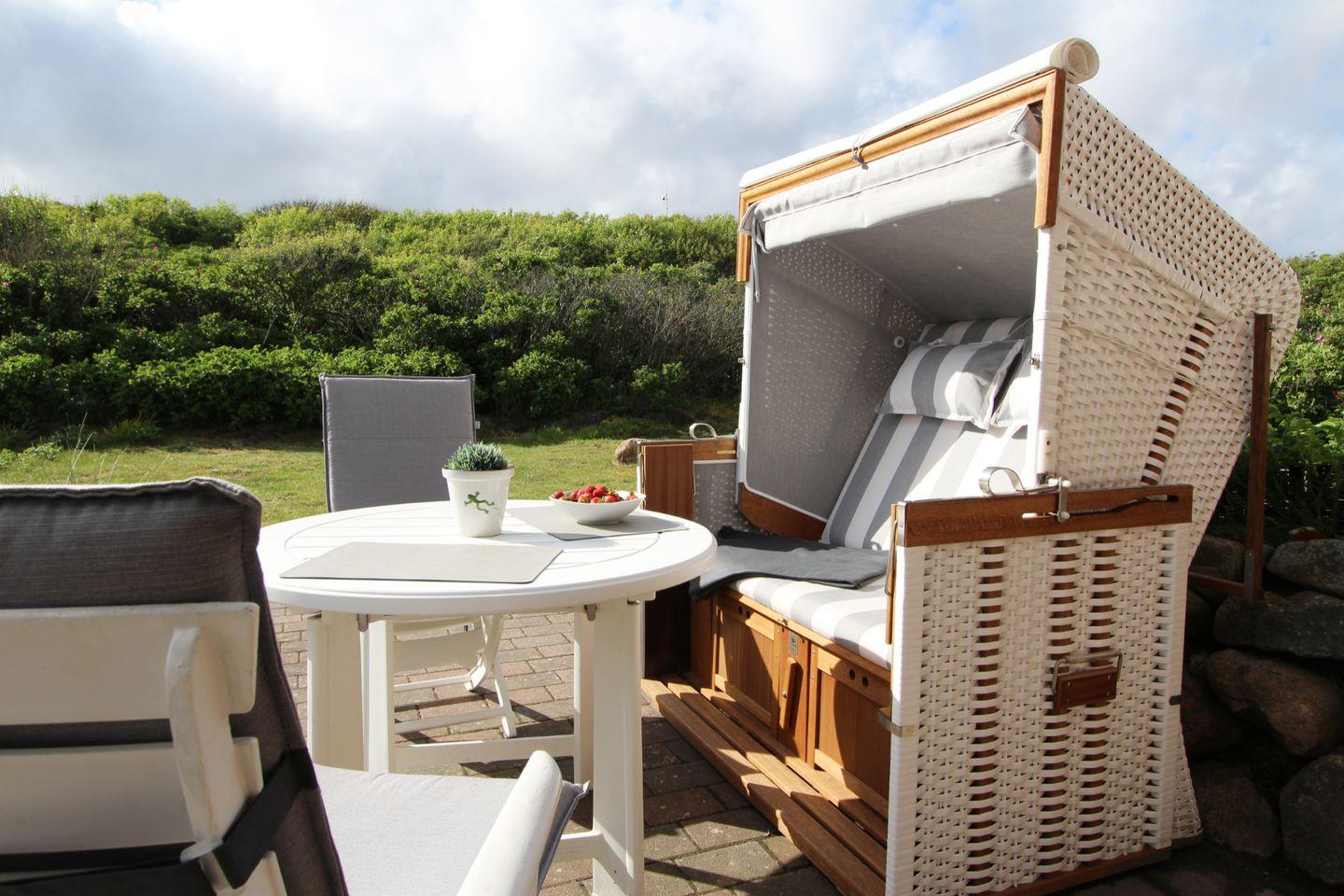 Auf der großzügigen West-Terrasse schmecken Sie das Salz der Seeluft und entspannen durch das seichte Rauschen des Meeres. Ihnen steht ein eigener, extra breiter Strandkorb zur Verfügung (April bis Oktober) und Sie können die Abende mit Gästen auf den Terrassenmöbeln genießen!