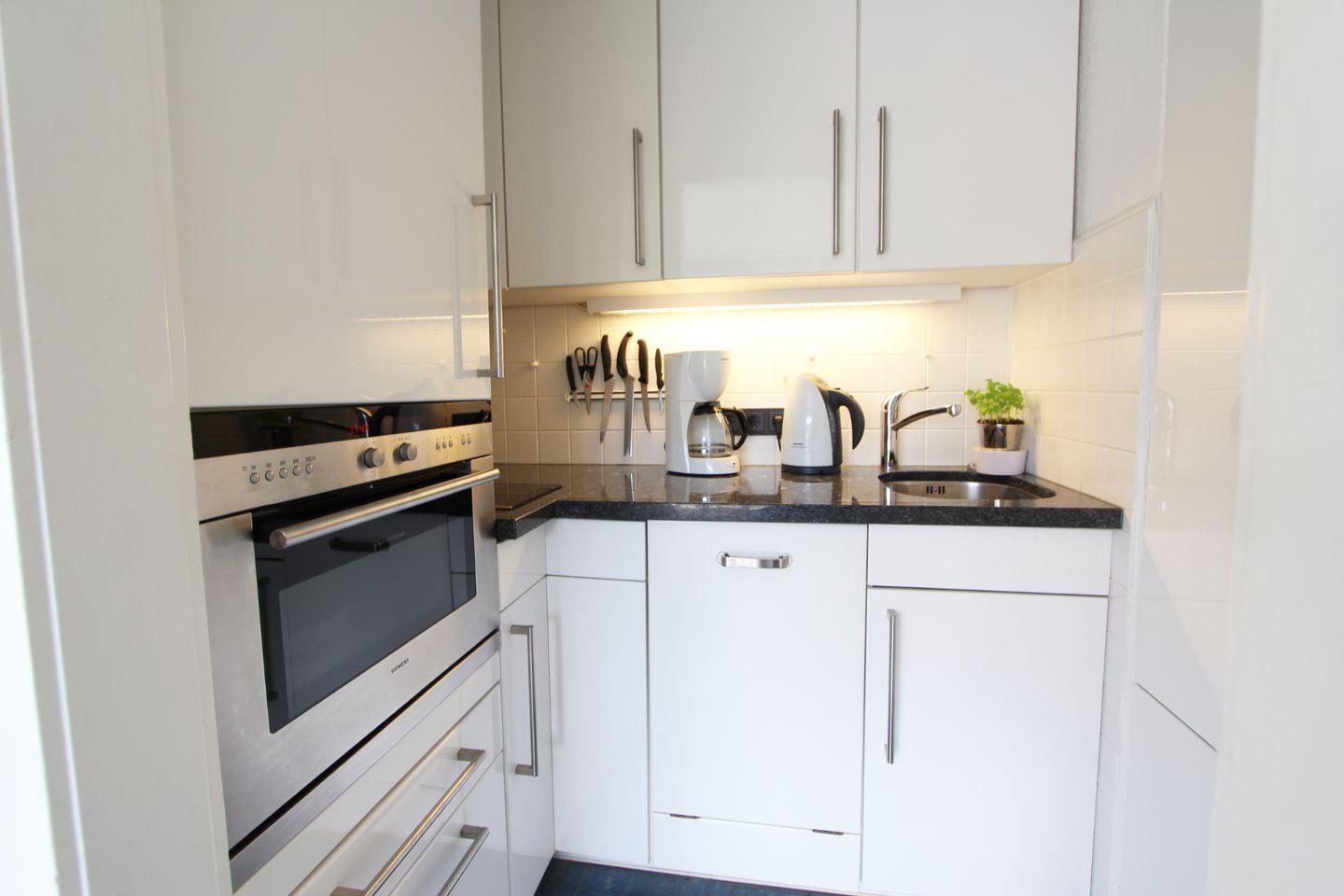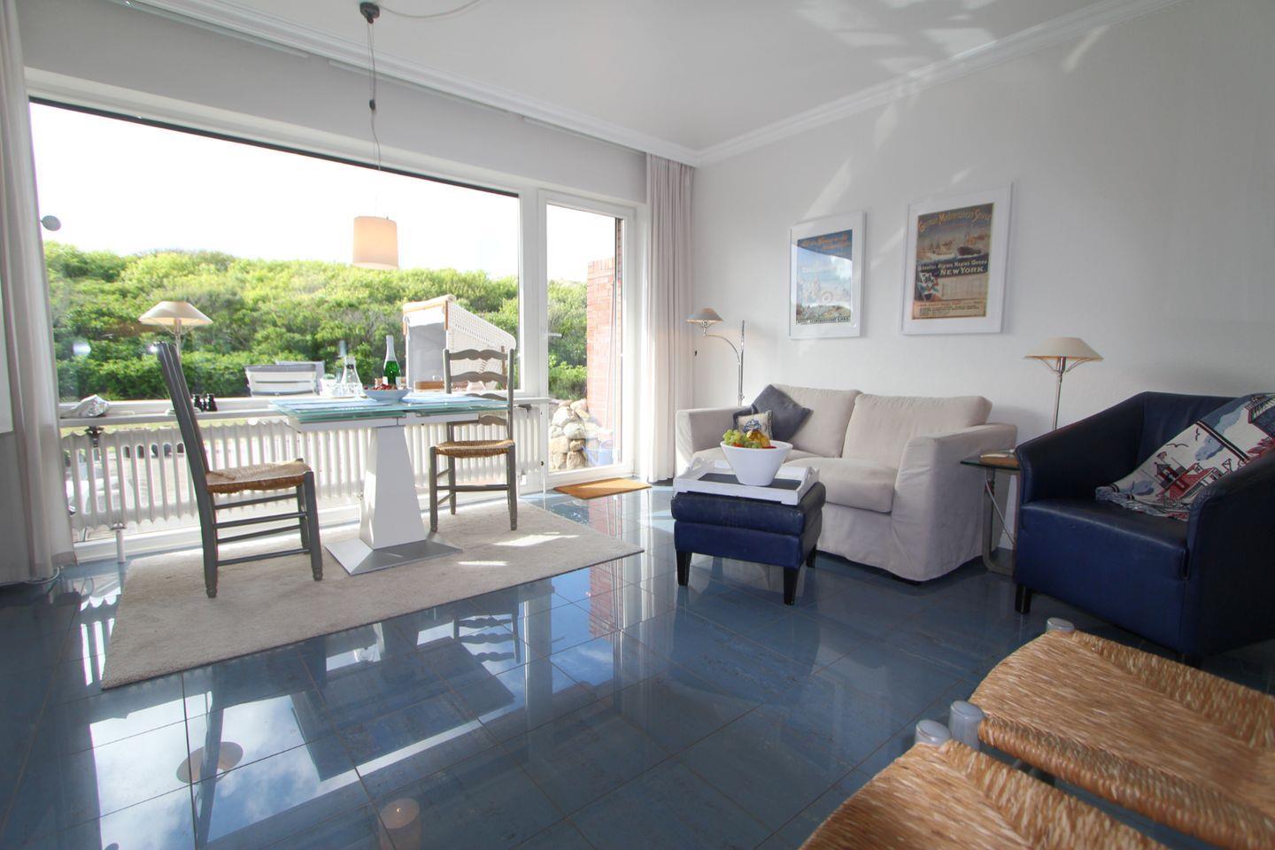 Zum Kochen können Sie die gut ausgestattete, neuwertige Kochnische nutzen, die direkt an den Wohnbereich angrenzt. Gespeist wird an der breiten Fensterfront mit fantastischem Dünenblick.