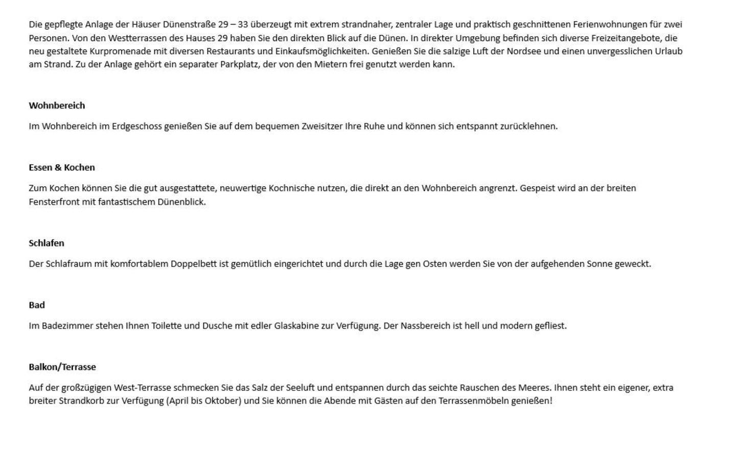 Die gepflegte Anlage der Häuser Dünenstraße 29 – 33 überzeugt mit extrem strandnaher, zentraler Lage und praktisch geschnittenen Ferienwohnungen für zwei Personen. Von den Westterrassen des Hauses 29 haben Sie den direkten Blick auf die Dünen. In direkter Umgebung befinden sich diverse Freizeitangebote, die neu gestaltete Kurpromenade mit diversen Restaurants und Einkaufsmöglichkeiten. Genießen Sie die salzige Luft der Nordsee und einen unvergesslichen Urlaub am Strand. Zu der Anlage gehört ein separater Parkplatz, der von den Mietern frei genutzt werden kann.