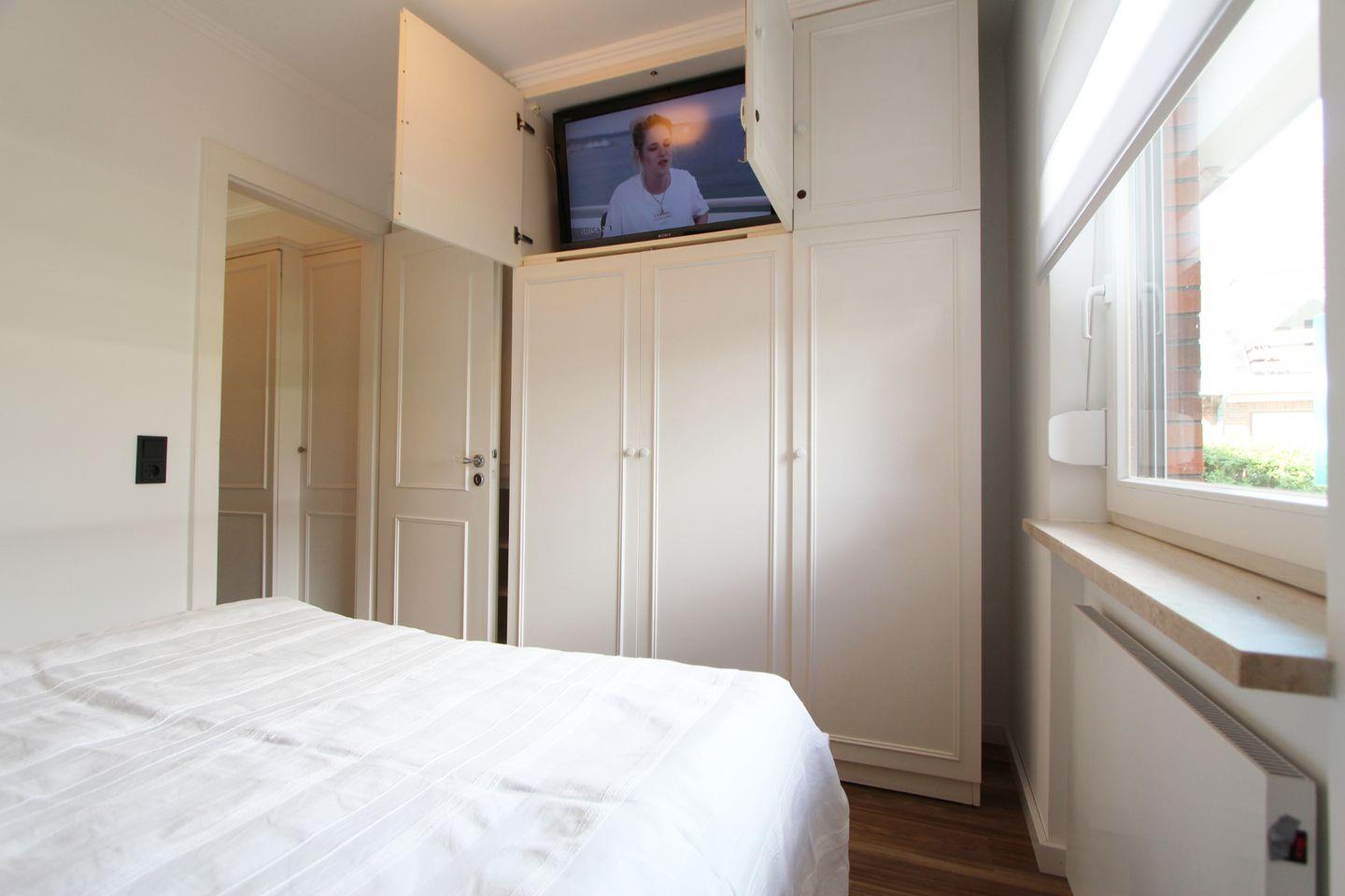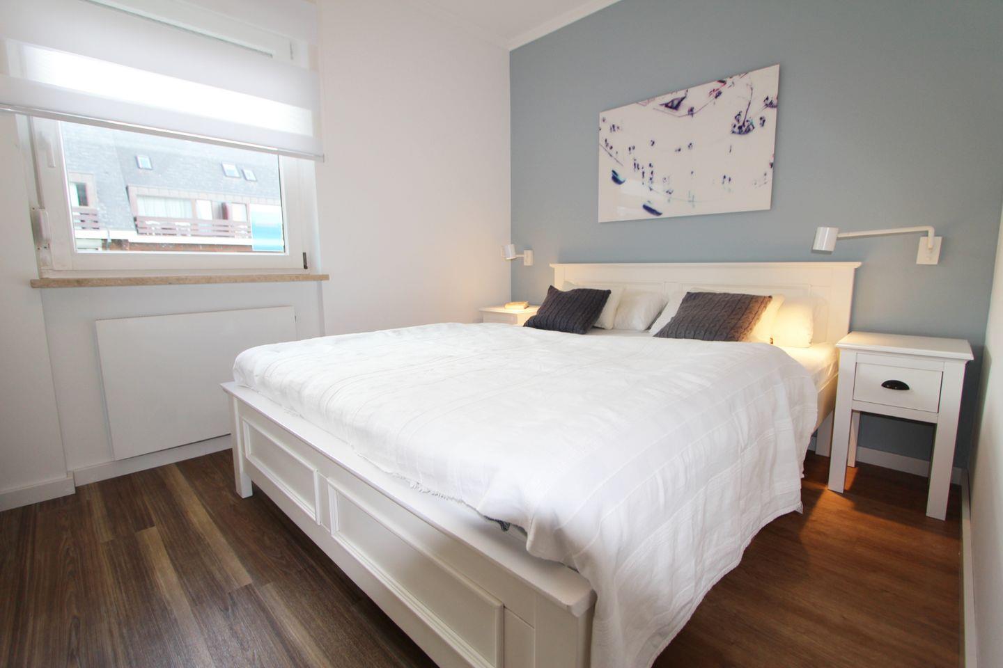 Der Schlafraum mit komfortablem Doppelbett ist gemütlich eingerichtet und durch die Lage gen Osten werden Sie von der aufgehenden Sonne geweckt.