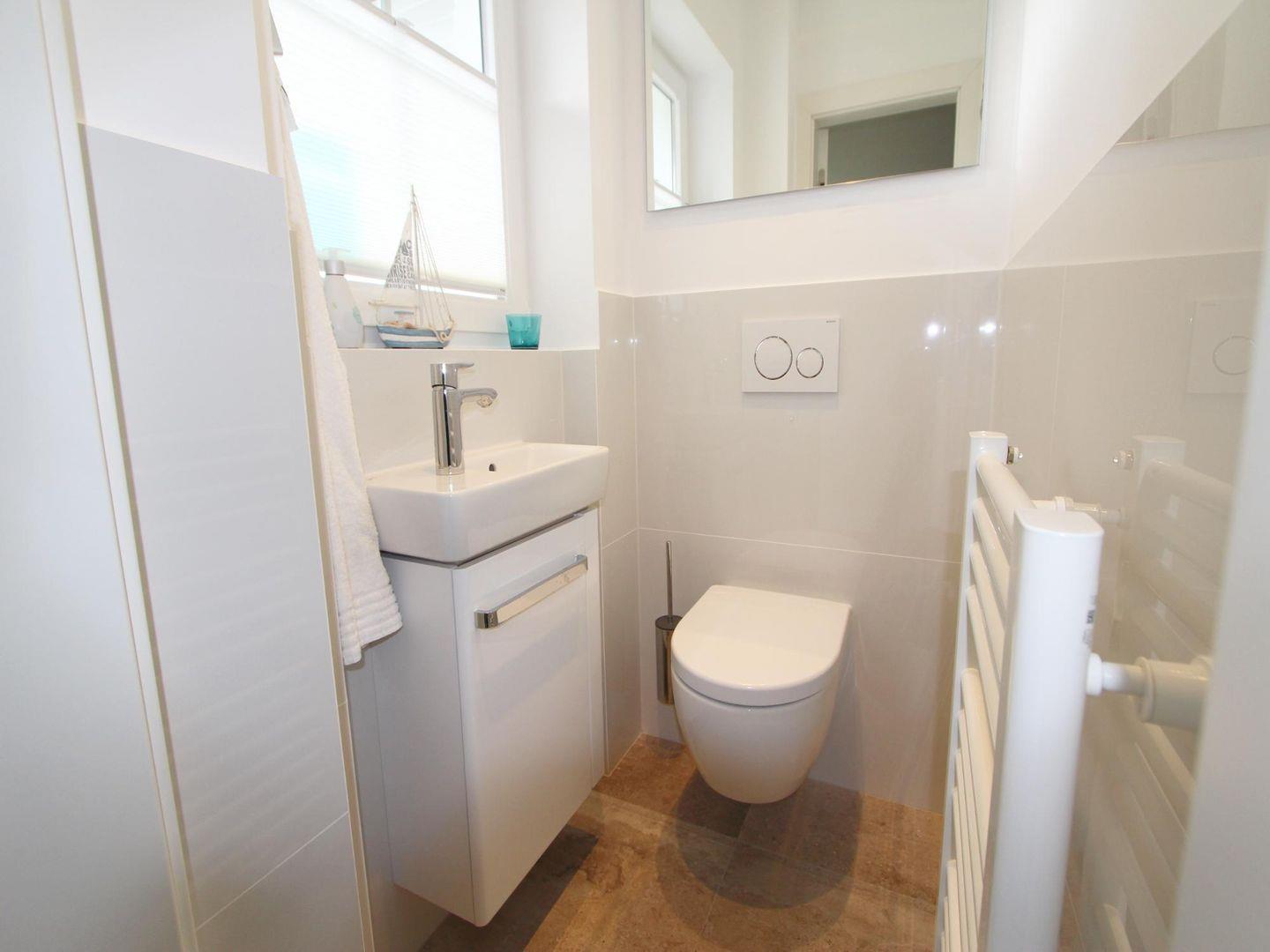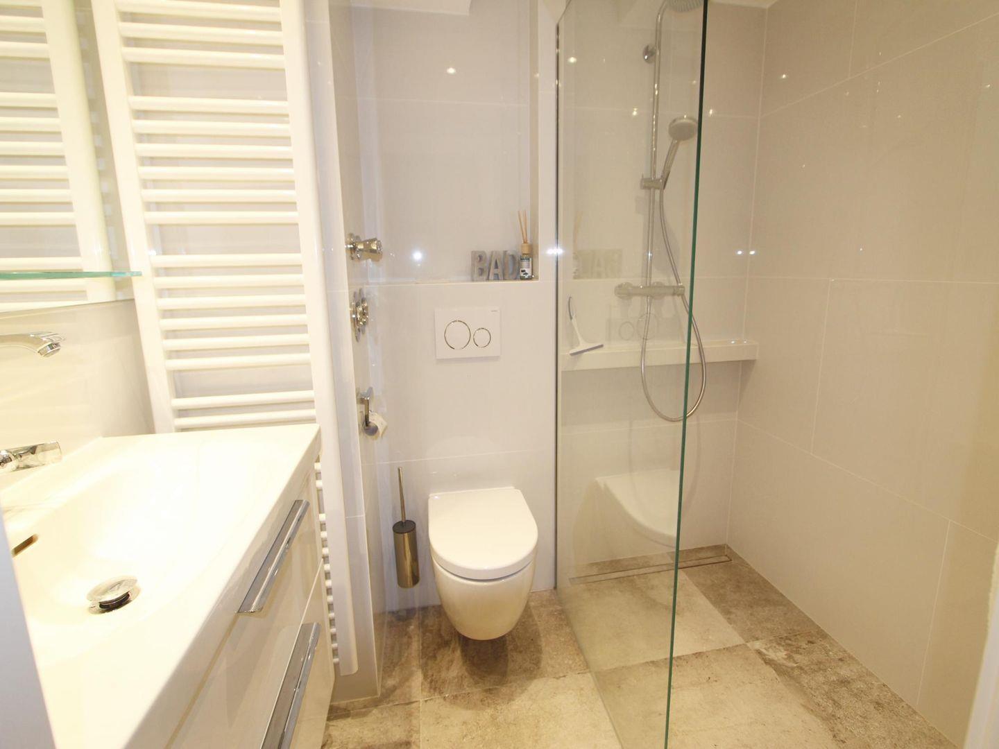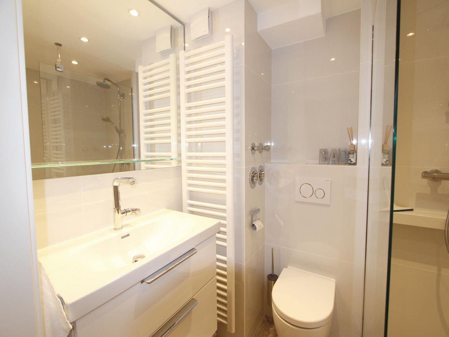Auf einer Ebene mit dem Wohn-Essbereich befindet sich ein Gäste-WC im Erdgeschoss. Darüber hinaus finden Sie im Untergeschoss ein Bad mit großzügiger, ebenerdiger Regendusche und WC vor. Hier steht Ihnen auch eine Waschmaschinen-Trockner-Kombination zur Verfügung.