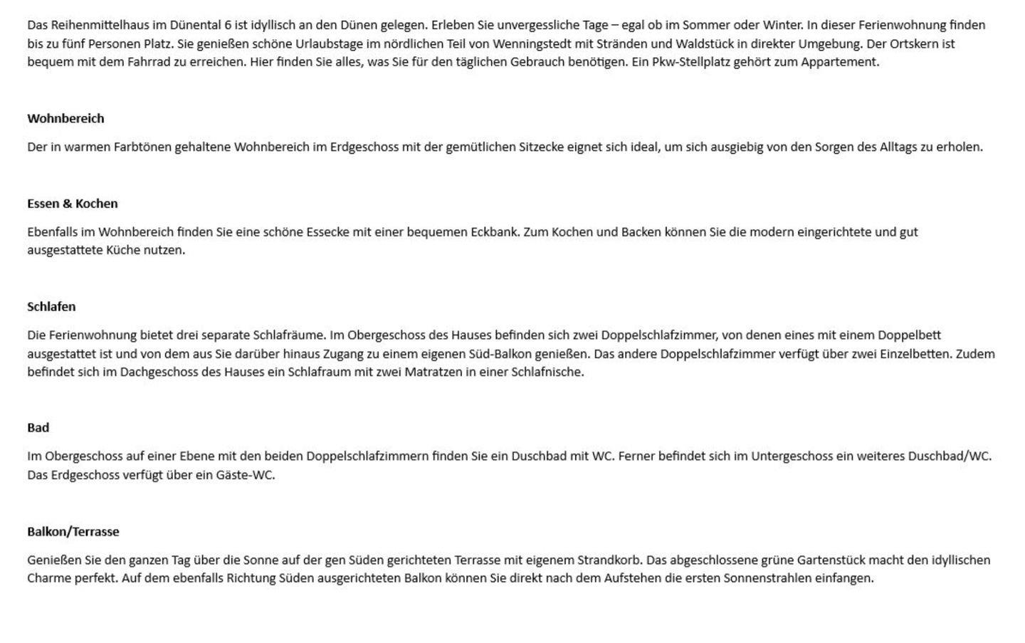 Das Reihenmittelhaus im Dünental 6 ist idyllisch an den Dünen gelegen. Erleben Sie unvergessliche Tage – egal ob im Sommer oder Winter. In dieser Ferienwohnung finden bis zu fünf Personen Platz. Sie genießen schöne Urlaubstage im nördlichen Teil von Wenningstedt mit Stränden und Waldstück in direkter Umgebung. Der Ortskern ist bequem mit dem Fahrrad zu erreichen. Hier finden Sie alles, was Sie für den täglichen Gebrauch benötigen. Ein Pkw-Stellplatz gehört zum Appartement.