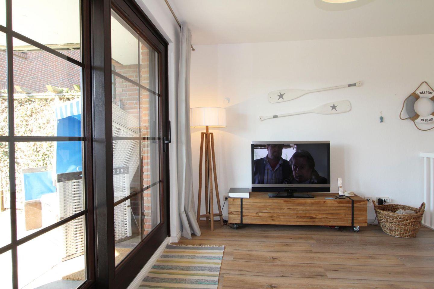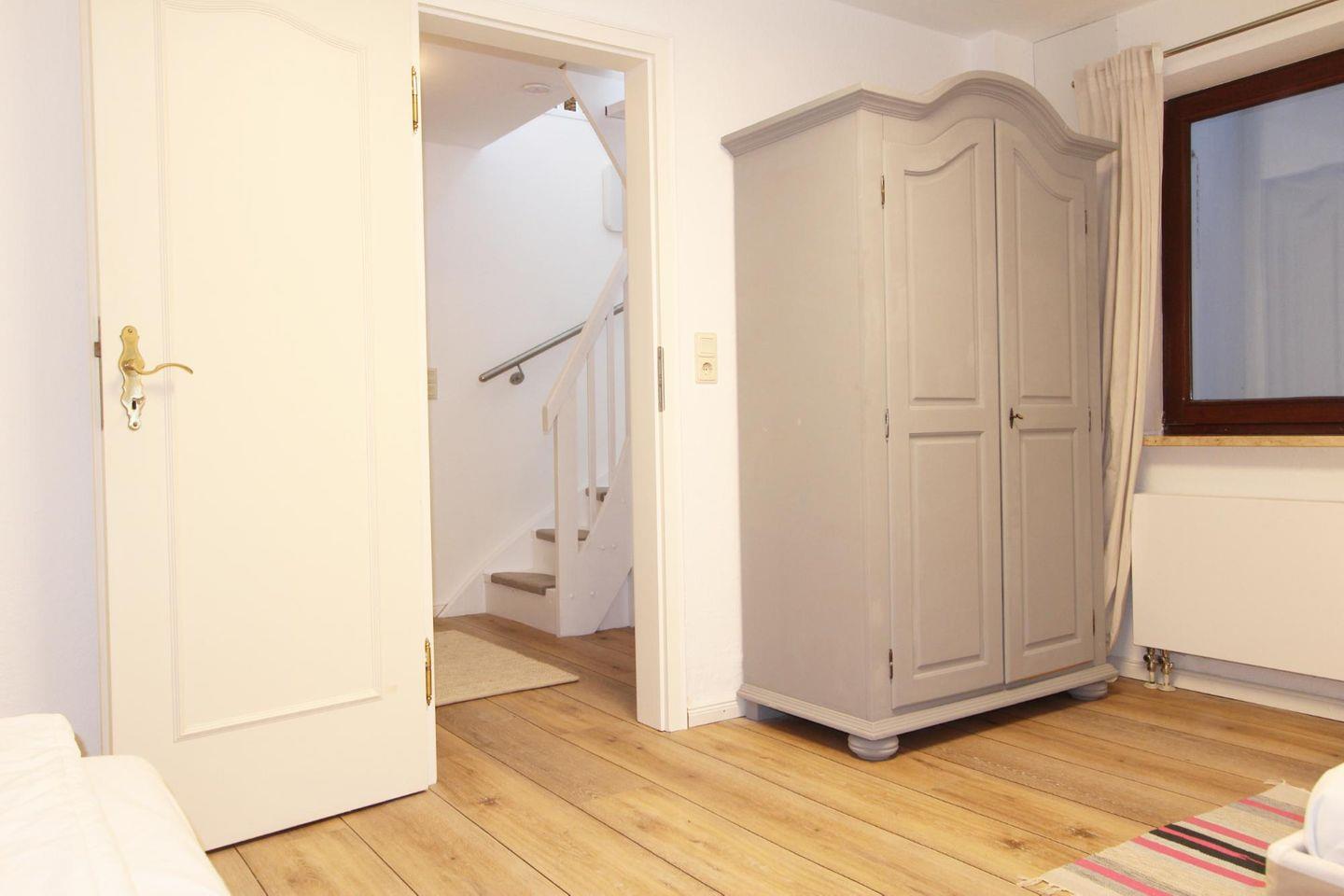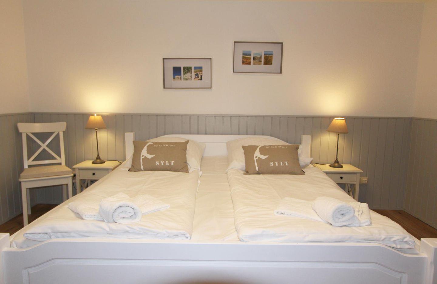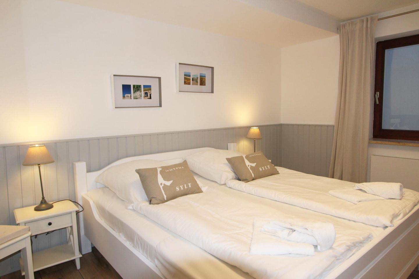Im Untergeschoss der Ferienwohnung finden Sie zwei Schlafzimmer. Das hell eingerichtete Doppelschlafzimmer verfügt über ein Doppelbett und ein zweites TV-Gerät. Der Schlafraum mit zwei Einzelbetten ist maritim eingerichtet und besticht durch seine ruhige Atmosphäre.