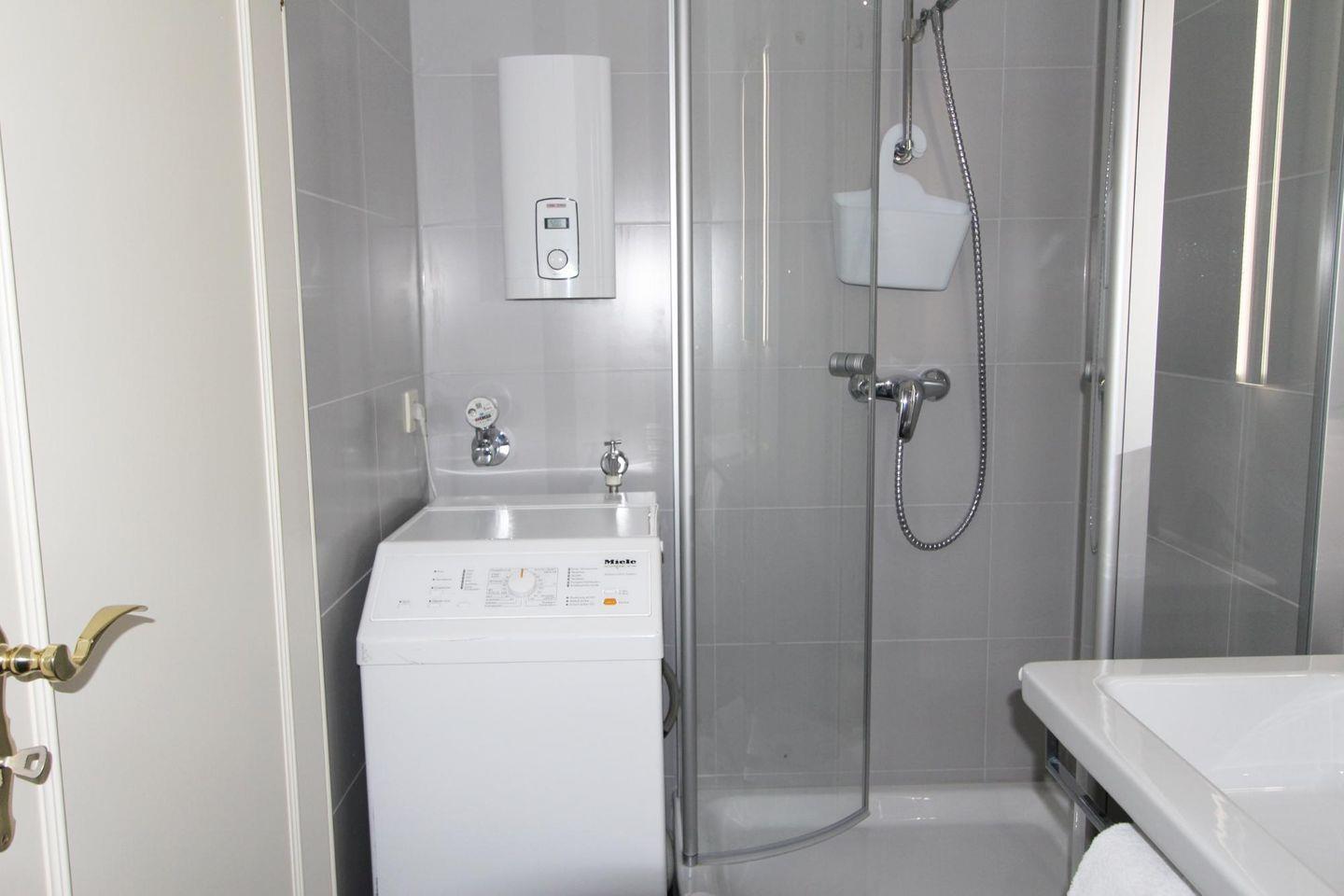Das modern geflieste Badezimmer befindet sich auf der Ebene der Schlafräume im Untergeschoss. Hier stehen Ihnen Dusche, WC und Waschmaschine zur Verfügung.
