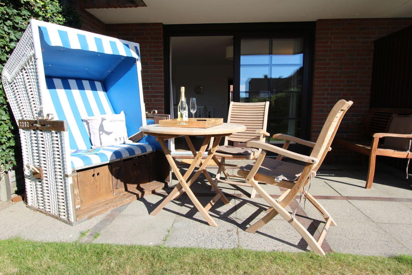 Genießen Sie ein gemütliches Frühstück mit Ihren Liebsten auf der tollen West-Terrasse mit eigenem Strandkorb (April bis Oktober). Dieses Ferienappartement garantiert einen unvergesslichen und erholsamen Urlaub auf der Nordseeinsel Sylt!