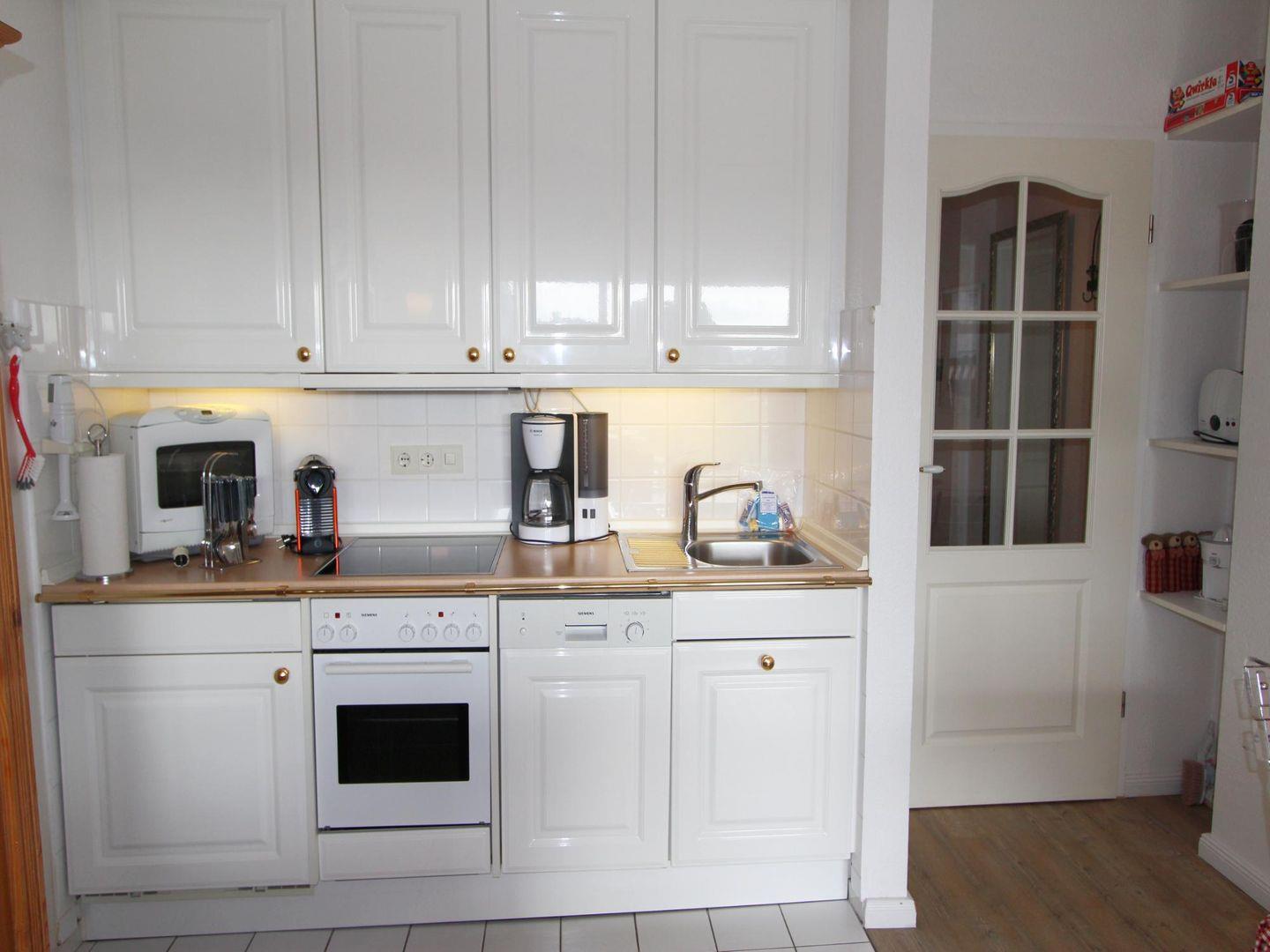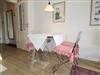 Zur kulinarischen Verpflegung steht die kleine Küchenzeile zur Verfügung. Der angrenzende Esstisch bietet Platz für bis zu vier Personen.