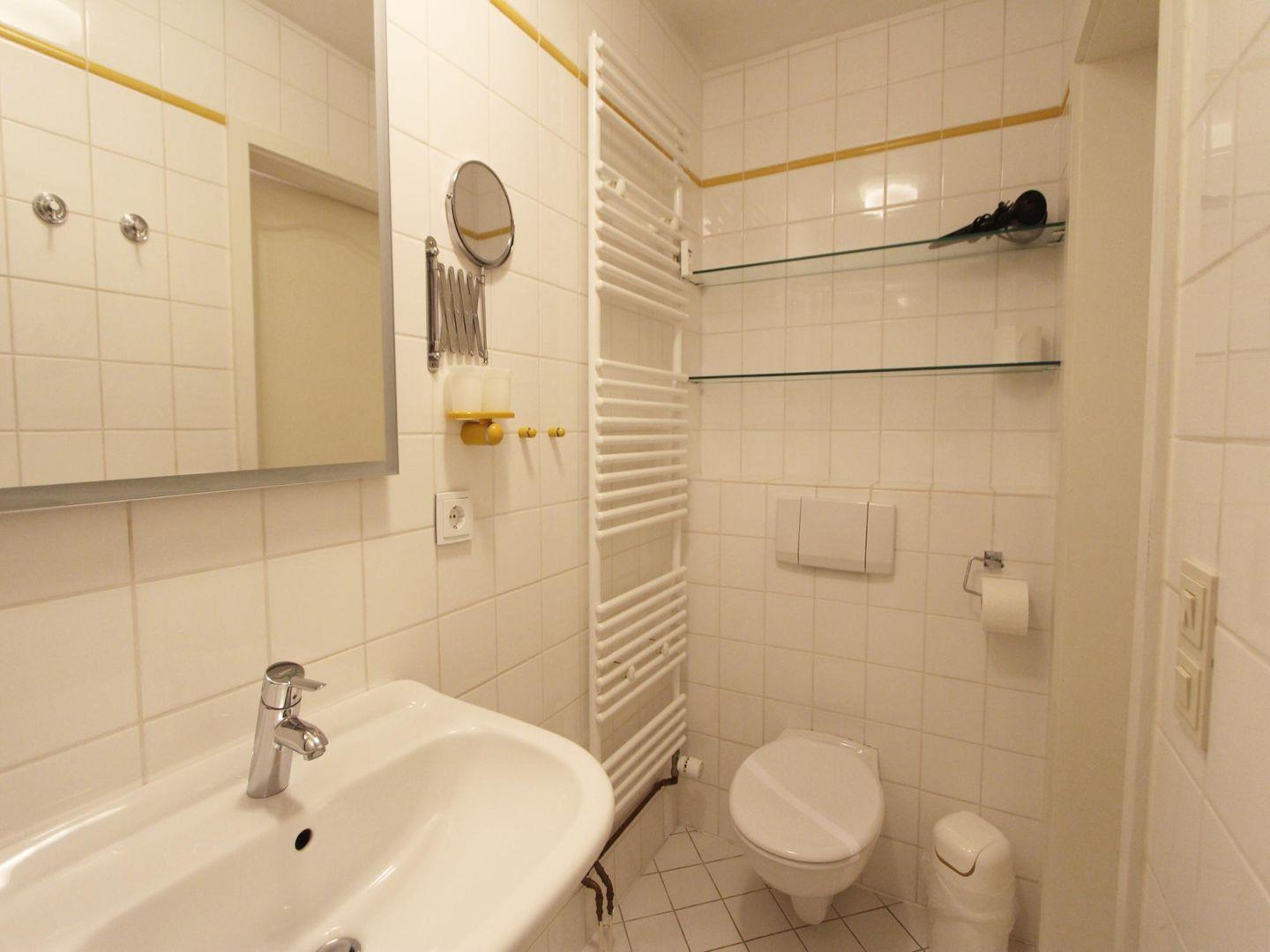 Ebenfalls im Untergeschoss liegt das Duschbad mit WC. Es ist hell gefliest und bietet genügend Platz. Im Keller des Hauses befinden sich Waschmaschine und Trockner als Münzgeräte.