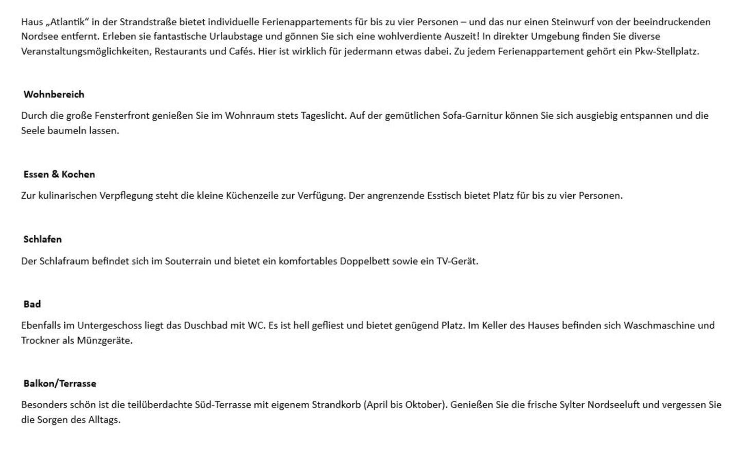 Haus „Atlantik“ in der Strandstraße bietet individuelle Ferienappartements für bis zu vier Personen – und das nur einen Steinwurf von der beeindruckenden Nordsee entfernt. Erleben sie fantastische Urlaubstage und gönnen Sie sich eine wohlverdiente Auszeit! In direkter Umgebung finden Sie diverse Veranstaltungsmöglichkeiten, Restaurants und Cafés. Hier ist wirklich für jedermann etwas dabei. Zu jedem Ferienappartement gehört ein Pkw-Stellplatz.