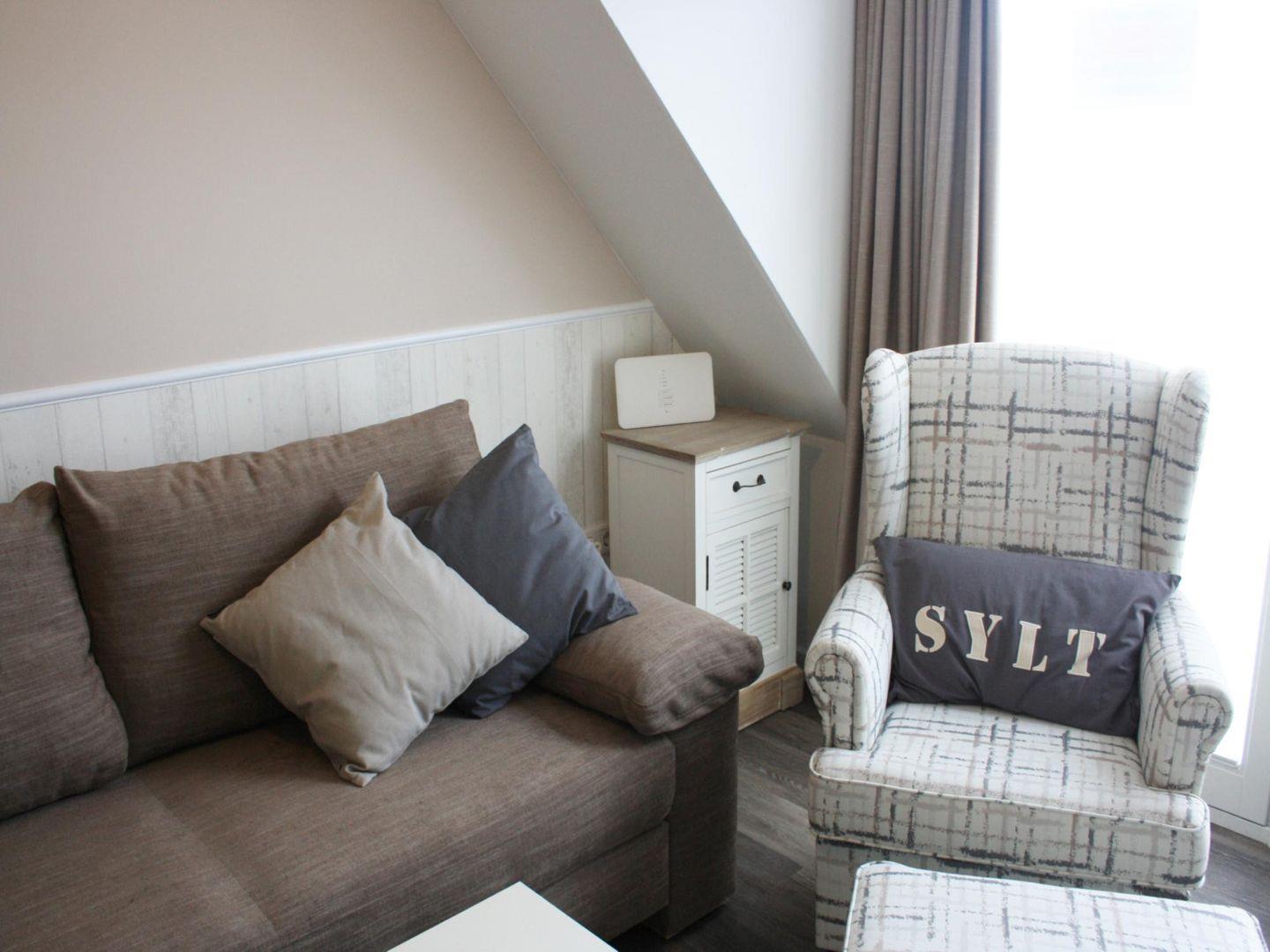 Im Wohnzimmer im Obergeschoss genießen Sie den Komfort eines sehr bequemen Zweisitzers, der als getrennte Schlafmöglichkeit auch zum Schlafplatz umfunktioniert werden kann. Darüber hinaus können Sie den Ohrensessel mit Fußteil nutzen, damit Sie sich rundum entspannen können.
