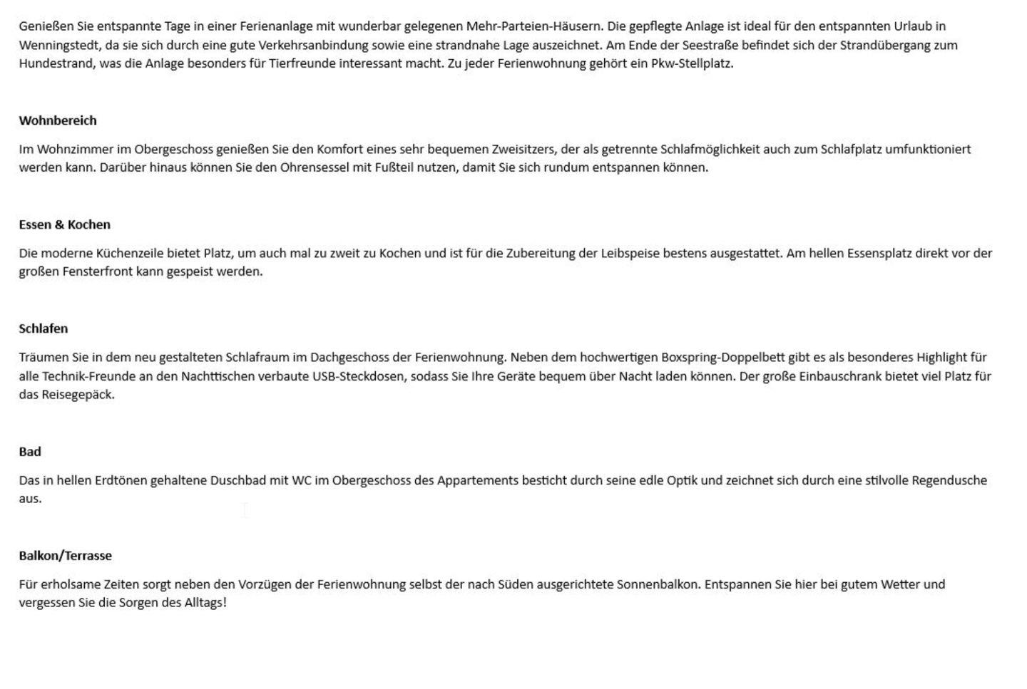 Genießen Sie entspannte Tage in einer Ferienanlage mit wunderbar gelegenen Mehr-Parteien-Häusern. Die gepflegte Anlage ist ideal für den entspannten Urlaub in Wenningstedt, da sie sich durch eine gute Verkehrsanbindung sowie eine strandnahe Lage auszeichnet. Am Ende der Seestraße befindet sich der Strandübergang zum Hundestrand, was die Anlage besonders für Tierfreunde interessant macht. Zu jeder Ferienwohnung gehört ein Pkw-Stellplatz.