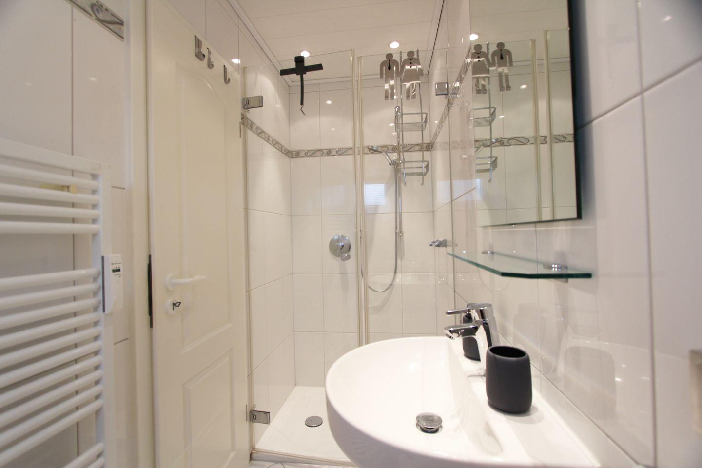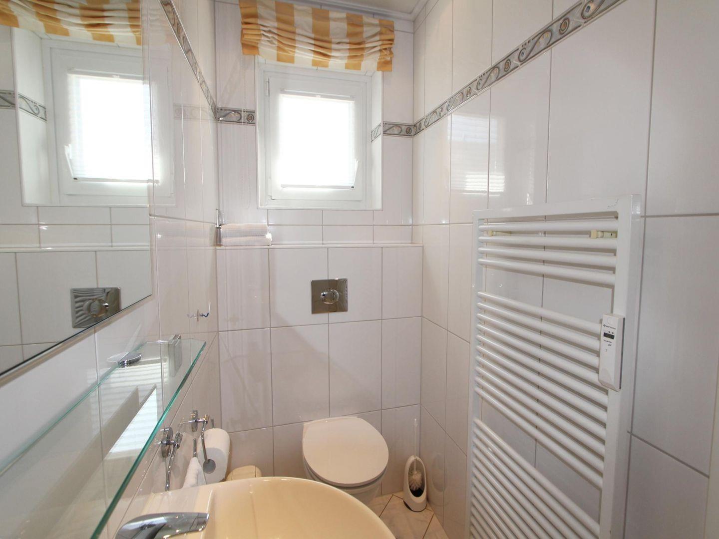 Das Badezimmer ist weiß gefliest und durch ein Fenster vom Tageslicht erhellt. Außerdem stehen Ihnen eine Münz-Waschmaschine und ein Münz-Trockner zur Verfügung.