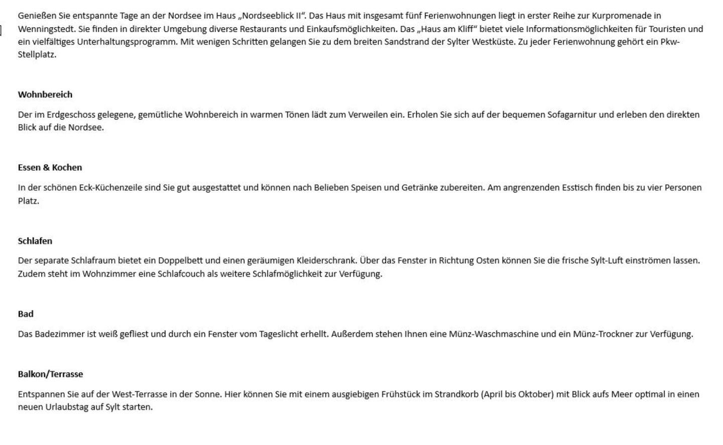 Genießen Sie entspannte Tage an der Nordsee im Haus „Nordseeblick II“. Das Haus mit insgesamt fünf Ferienwohnungen liegt in erster Reihe zur Kurpromenade in Wenningstedt. Sie finden in direkter Umgebung diverse Restaurants und Einkaufsmöglichkeiten. Das „Haus am Kliff“ bietet viele Informationsmöglichkeiten für Touristen und ein vielfältiges Unterhaltungsprogramm. Mit wenigen Schritten gelangen Sie zu dem breiten Sandstrand der Sylter Westküste. Zu jeder Ferienwohnung gehört ein Pkw-Stellplatz.