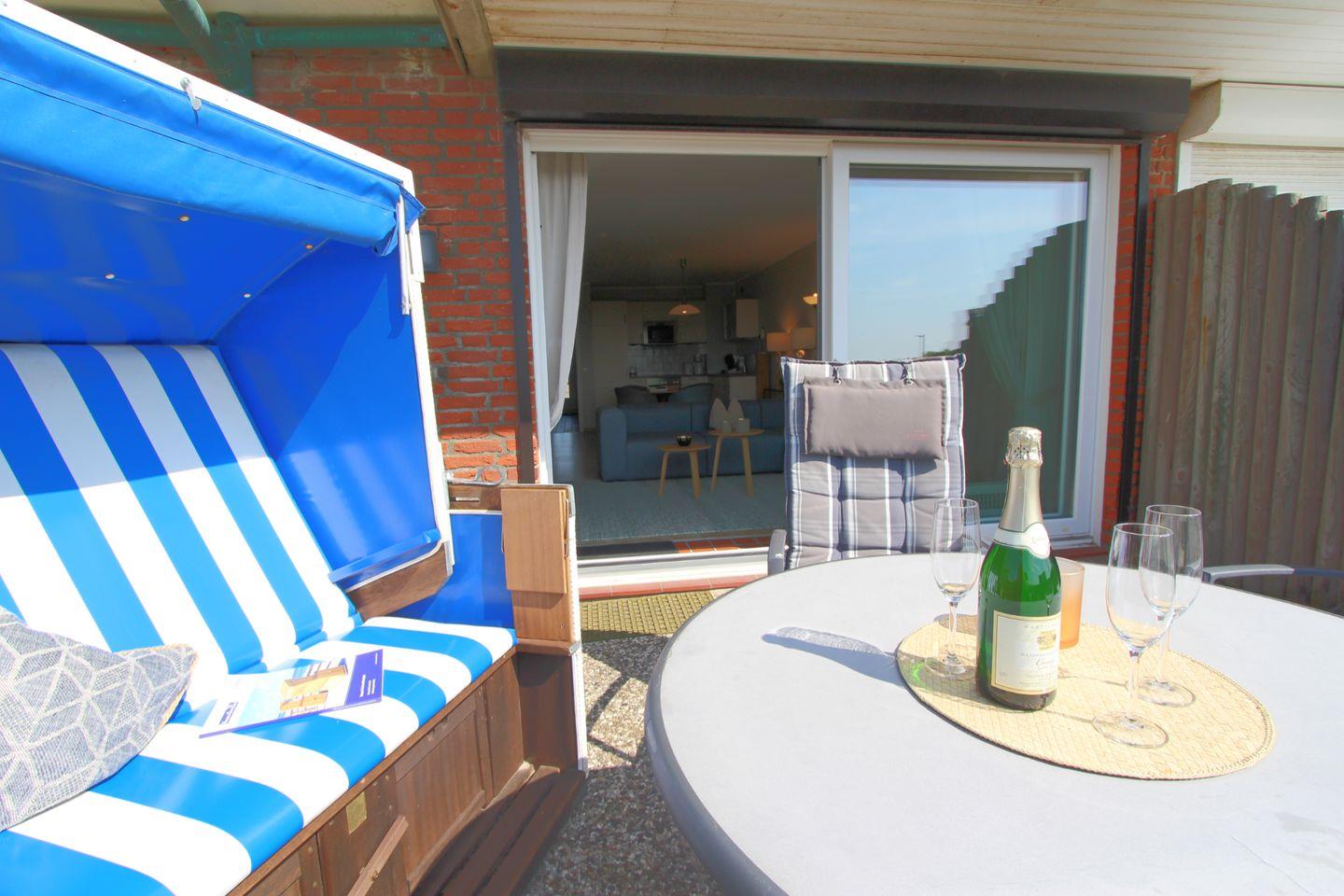 Entspannen Sie auf der West-Terrasse in der Sonne. Hier können Sie mit einem ausgiebigen Frühstück im Strandkorb (April bis Oktober) mit Blick aufs Meer optimal in einen neuen Urlaubstag auf Sylt starten.