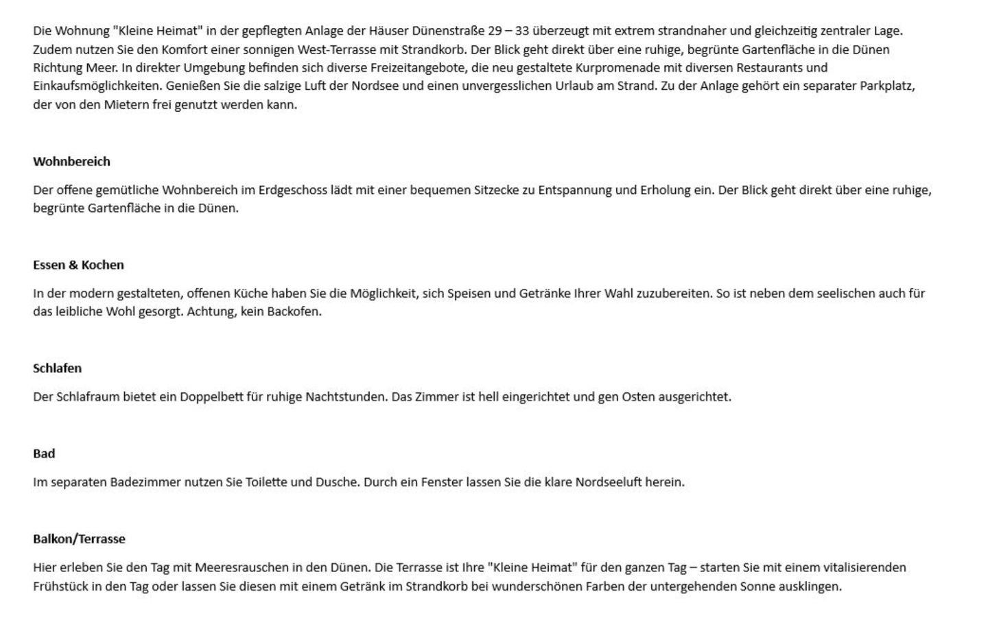 Die Wohnung "Kleine Heimat" in der gepflegten Anlage der Häuser Dünenstraße 29 – 33 überzeugt mit extrem strandnaher und gleichzeitig zentraler Lage. Zudem nutzen Sie den Komfort einer sonnigen West-Terrasse mit Strandkorb. Der Blick geht direkt über eine ruhige, begrünte Gartenfläche in die Dünen Richtung Meer. In direkter Umgebung befinden sich diverse Freizeitangebote, die neu gestaltete Kurpromenade mit diversen Restaurants und Einkaufsmöglichkeiten. Genießen Sie die salzige Luft der Nordsee und einen unvergesslichen Urlaub am Strand. Zu der Anlage gehört ein separater Parkplatz, der von den Mietern frei genutzt werden kann.