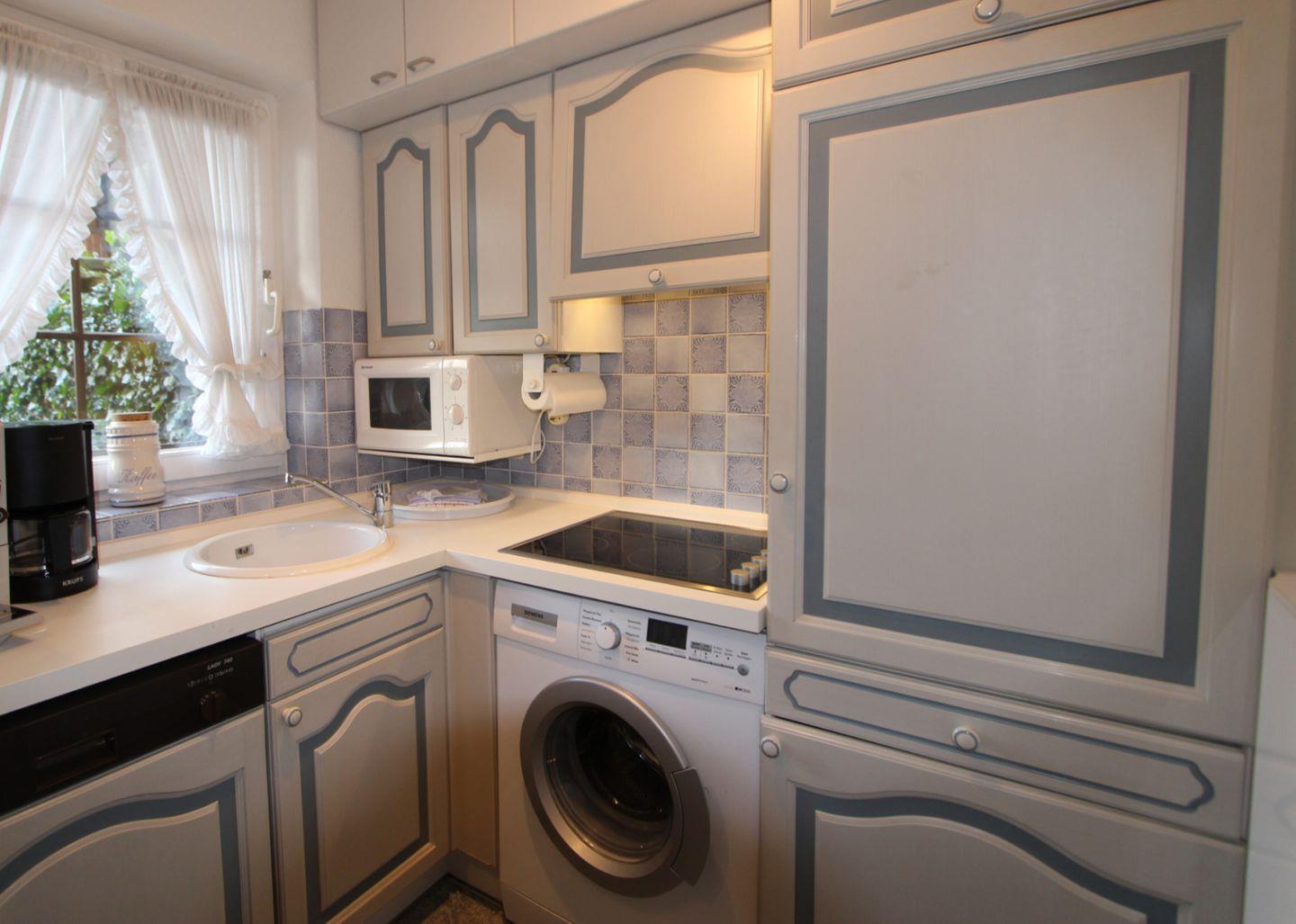 Die separate Küche im nordischen Stil bietet vollen Komfort. Der schöne Essensplatz ist direkt am dekorativen Elektro-Kamin gelegen.
