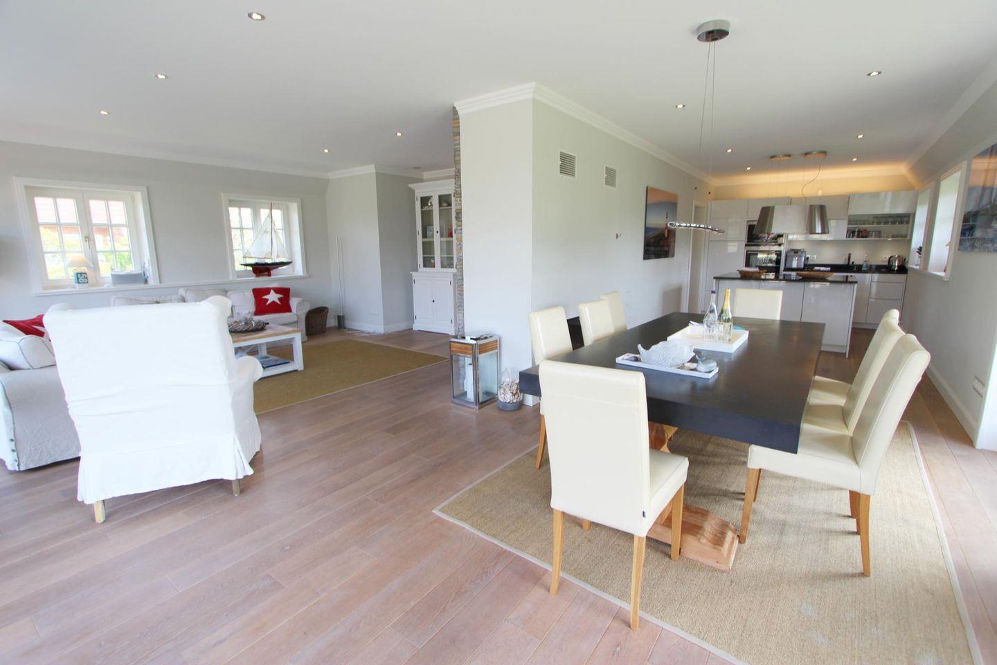 Die moderne Küche ist umfassend ausgestattet, sodass man entspannt gemeinsam kochen kann. Bereiten Sie hier mit viel Liebe zusammen Ihre Leibspeise zu. Am angrenzenden großen Essplatz finden bequem bis zu acht Personen Platz.
