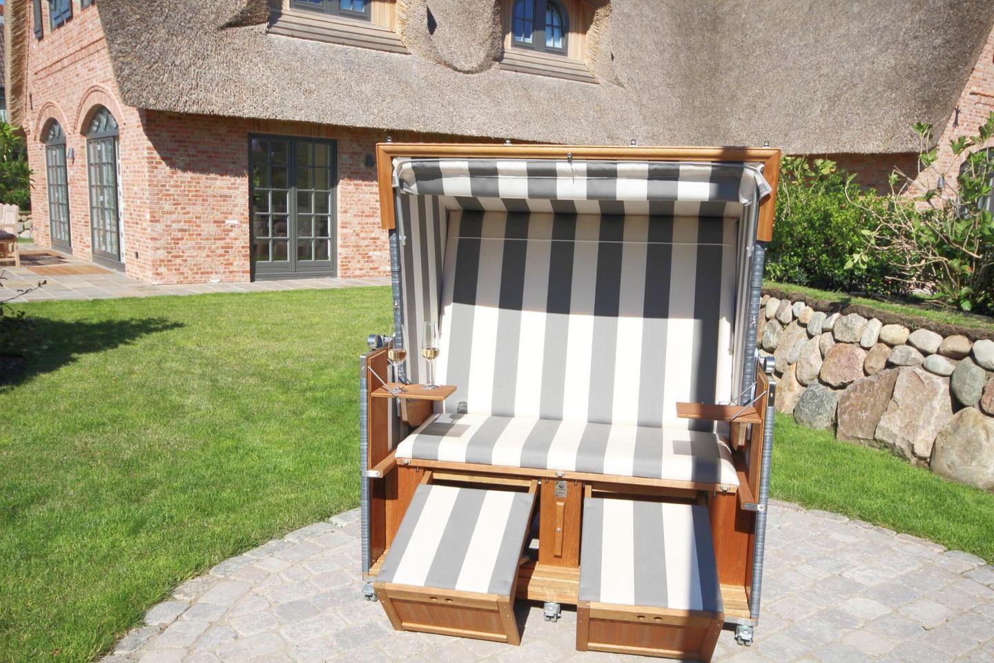 Der weitläufige Garten bietet zwei Terrassen zur ausgiebigen Erholung! Auf der West-Terrasse können Sie gemeinsam Zeit verbringen, da diese mit wertigen Gartensitzmöbeln versehen ist. Auf der Terrasse mit Süd-Ausrichtung können Sie im inseltypischen Strandkorb entspannen und die Seele baumeln lassen.