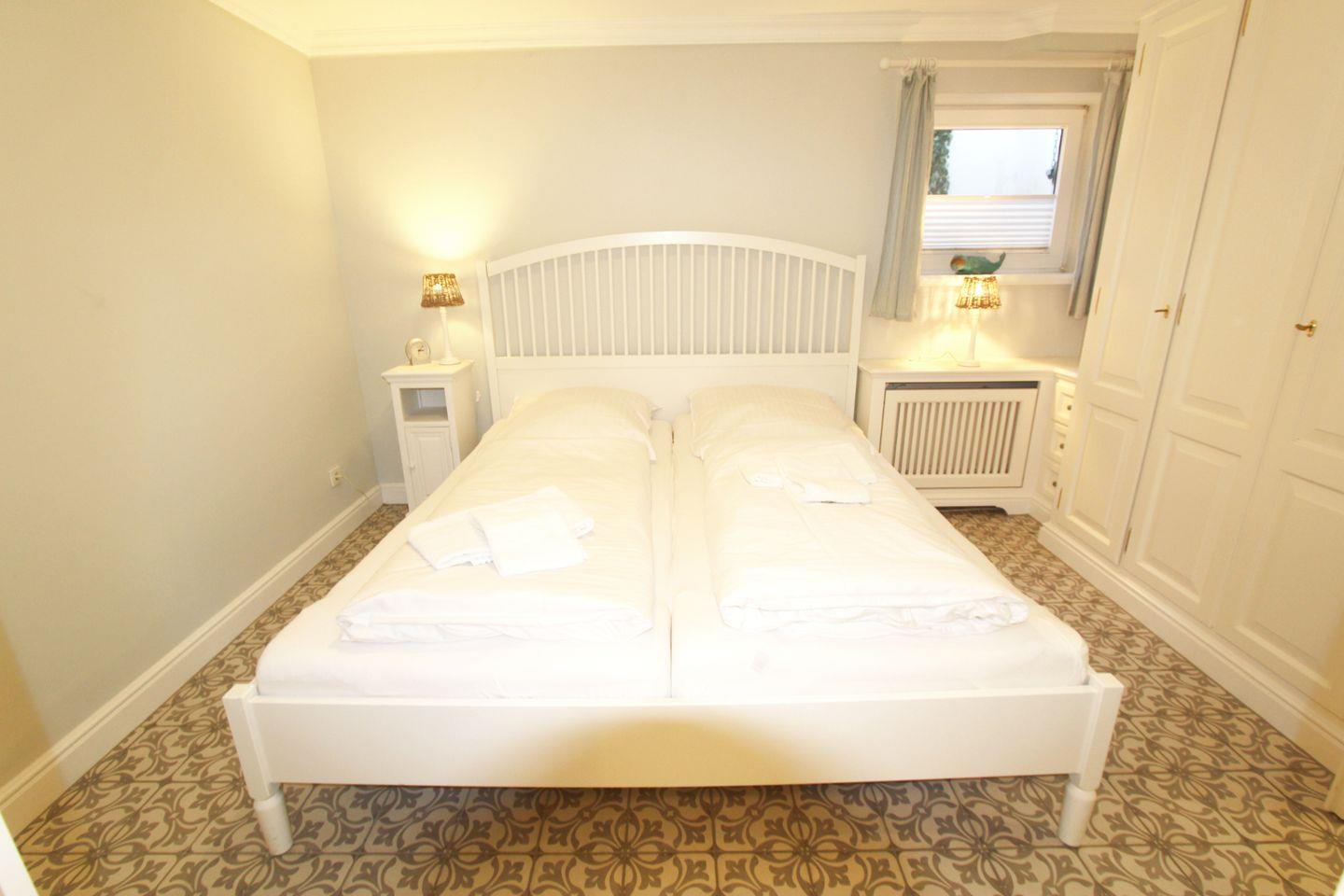 Im Schlafzimmer im Untergeschoss erwarten Sie ein gemütliches Doppelbett sowie ein maßgefertigter, geräumiger Kleiderschrank.