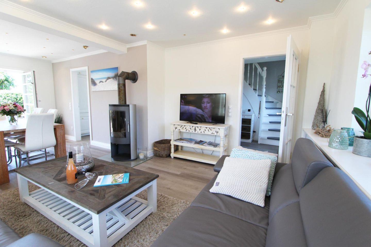 Der gemütliche Wohnbereich mit Kamin bietet allen Komfort und lädt zum Entspannen und Genießen ein.
