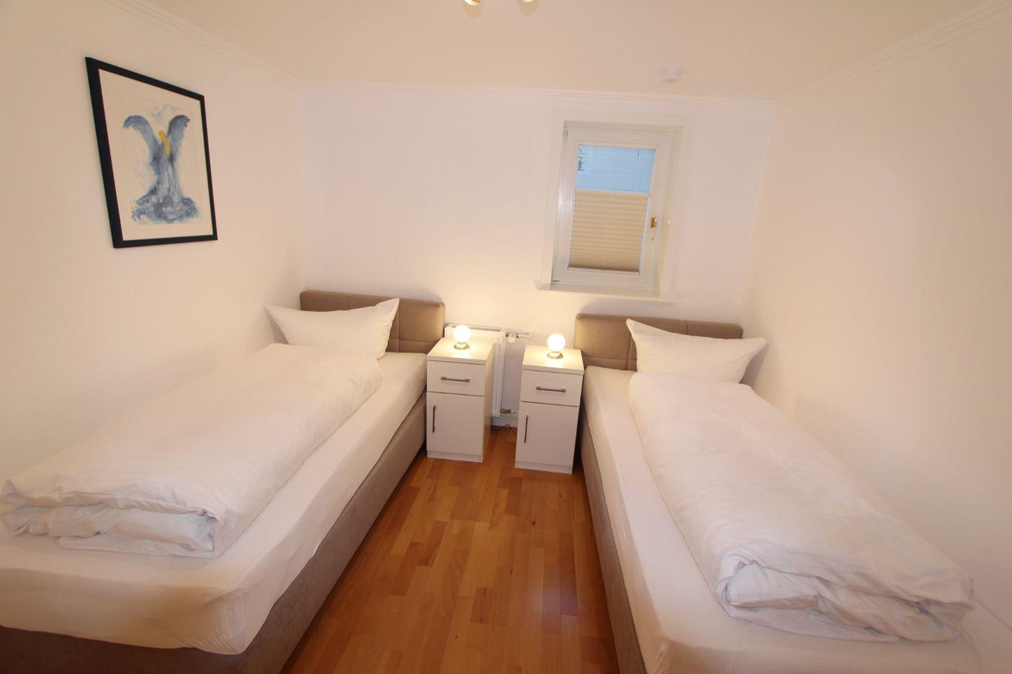 Im Untergeschoss der Ferienwohnung finden Sie zwei Schlafzimmer. Das größere Doppelschlafzimmer bietet Ihnen ein komfortables Boxspringbett (durchgehender Topper). Im kleineren Schlafzimmer stehen Ihnen zwei einzelne Boxspringbetten.