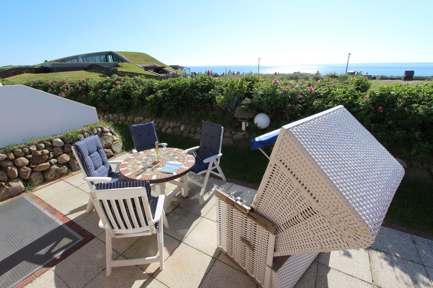 Erholen Sie sich auf der sonngefluteten großen West-Terrasse und lassen Sie die klare und erfrischende Nordseeluft bis in Ihr Wohnzimmer herein. Sie nutzen von April bis Oktober einen charakteristischen Strandkorb.