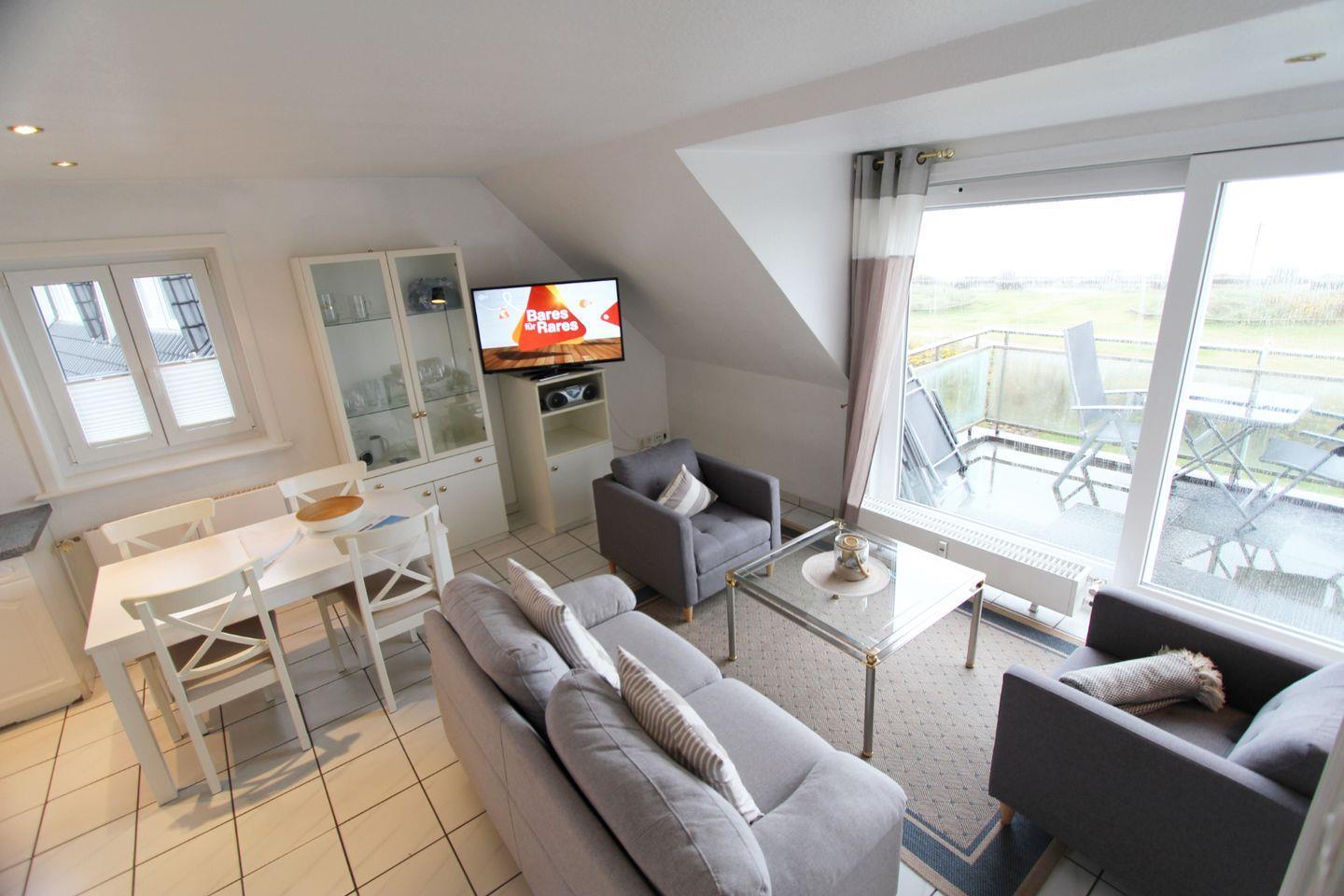 In der eingebauten Küchenzeile finden Sie ausreichend Platz, um zu kochen und zu genießen. An dem gemütlichen Esstisch finden bis zu vier Personen Platz und blicken dabei auf die Weite der Nordsee.