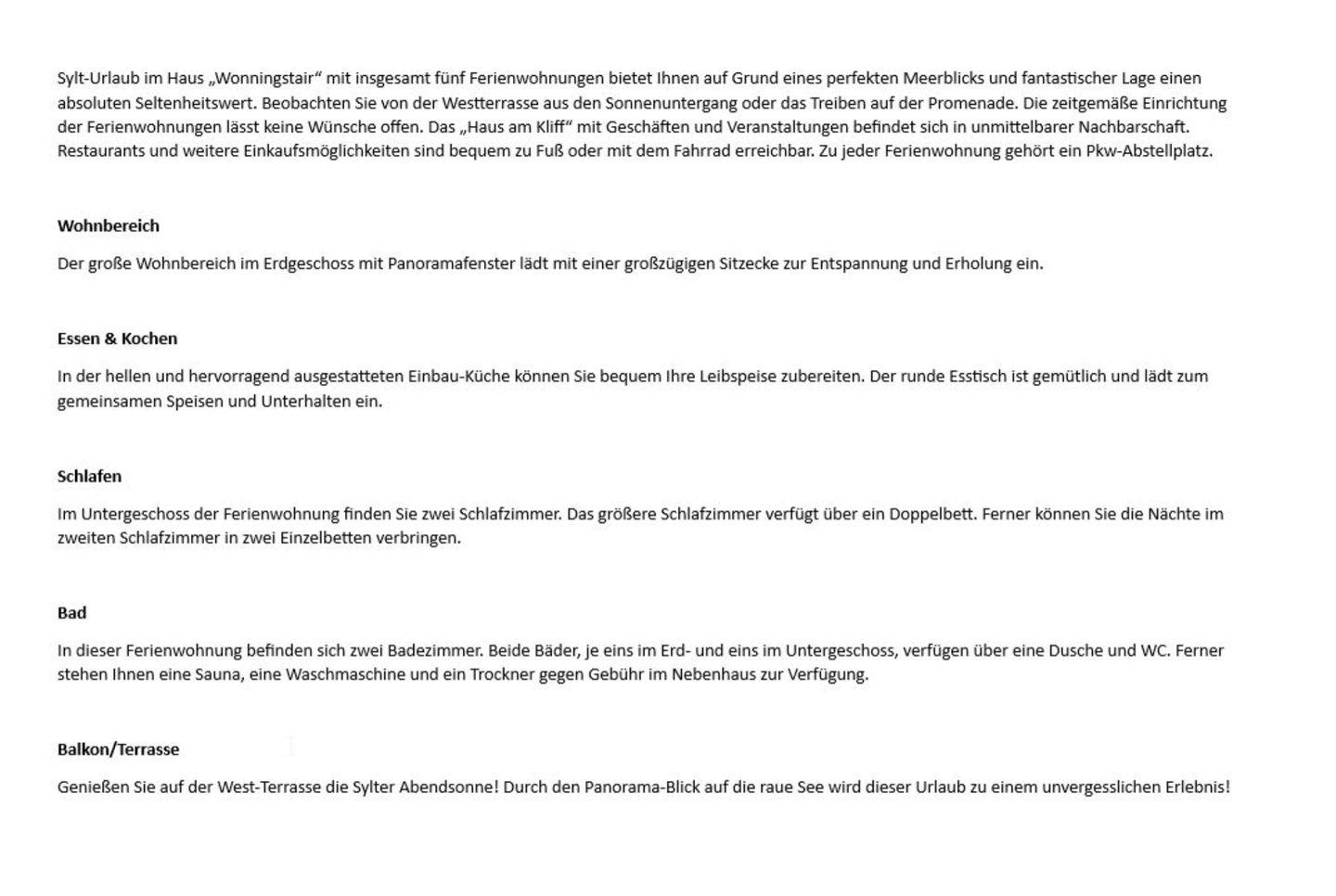 Sylt-Urlaub im Haus „Wonningstair“ mit insgesamt fünf Ferienwohnungen bietet Ihnen auf Grund eines perfekten Meerblicks und fantastischer Lage einen absoluten Seltenheitswert. Beobachten Sie von der Westterrasse aus den Sonnenuntergang oder das Treiben auf der Promenade. Die zeitgemäße Einrichtung der Ferienwohnungen lässt keine Wünsche offen. Das „Haus am Kliff“ mit Geschäften und Veranstaltungen befindet sich in unmittelbarer Nachbarschaft. Restaurants und weitere Einkaufsmöglichkeiten sind bequem zu Fuß oder mit dem Fahrrad erreichbar. Zu jeder Ferienwohnung gehört ein Pkw-Abstellplatz.